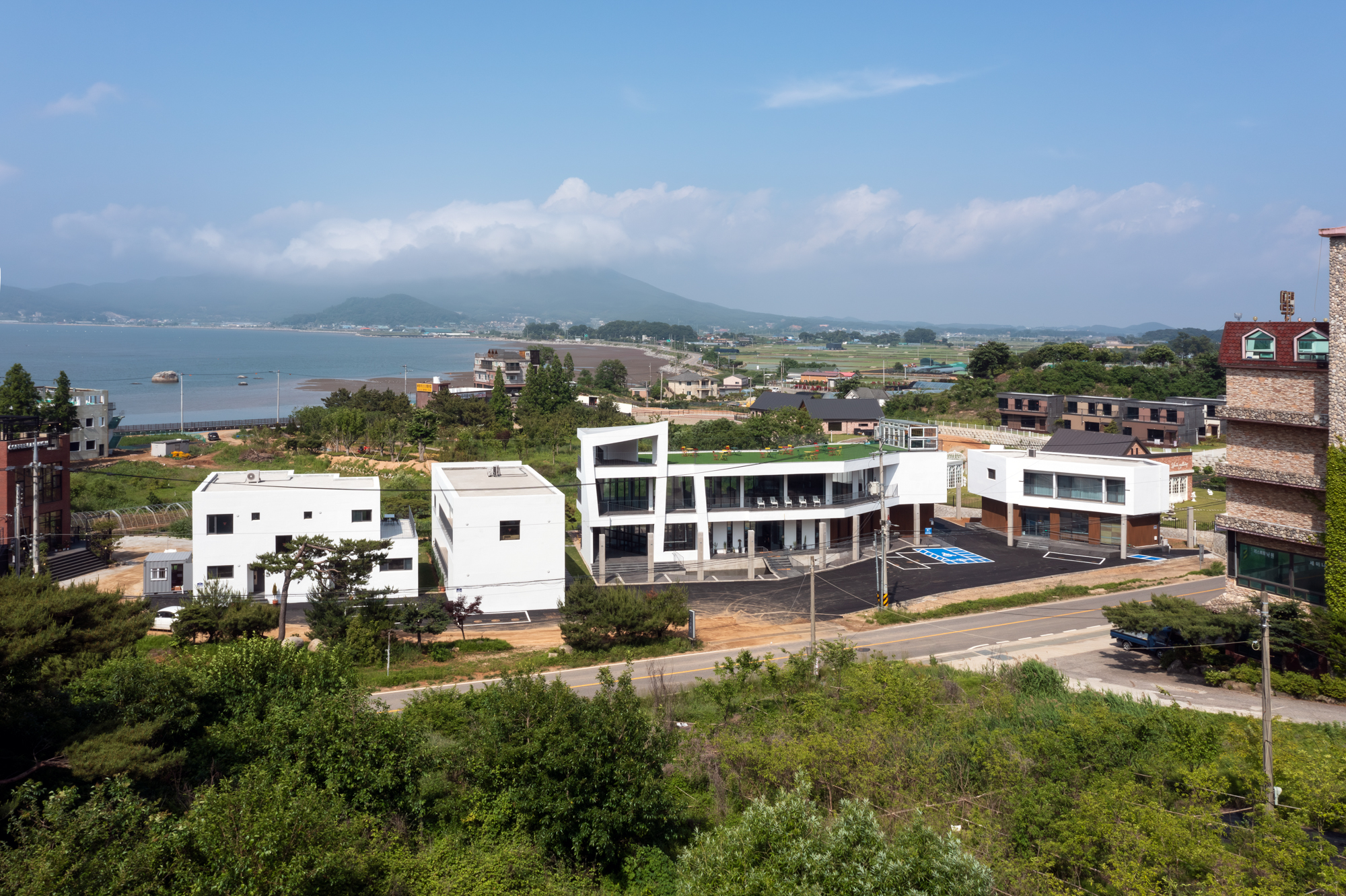 풍경이 핵심인 대지에 바닥, 벽, 천장으로 이루어진 육면체들을 쌓되, 계절과 시간마다 바뀌게 될 산, 바다, 그리고 들을 실내로 끌어들일 액자 틀을 요소마다 두었다. 건물과 건물 사이에는 꽃, 나무, 조각물 그리고 다양한 모양의 하늘을 담았다. 시시각각 연출될 자연의 그림(Figure)이 돋보여야 하기에 벽(Ground)들은 안팎 모두 하얀색으로 틀어막았다. 그리고 실내 곳곳에 건축주 부부가 키우고 있는 다육식물을 전시할 틀(Frame)도 조성했다. 화분 하나하나가 마치 산과 들을 축소한 듯하니, 이 또한 고객에게 보내는 건축주의 선물이다. ‘Everyday Special Coffee’라는 의미를 담은 건축물은 폐쇄 시각장치(VISTA)들이 이곳을 찾는 이들의 도시적 강퍅함을 자연의 심성으로 초기화(ESC)하는 도구가 되길 바라는 소망을 담았다. 설계 당시에는 의도하지 않았으나 그라운드 레벨에서는 보이지 않던 소원바위가 모든 펜션의 거실 창마다 슬그머니 그림(Figure)으로 다가와 있었다. 이곳을 찾은 사람들이 소원바위를 보며, 마음이 고요해지는 휴식을 보내길 바란다.