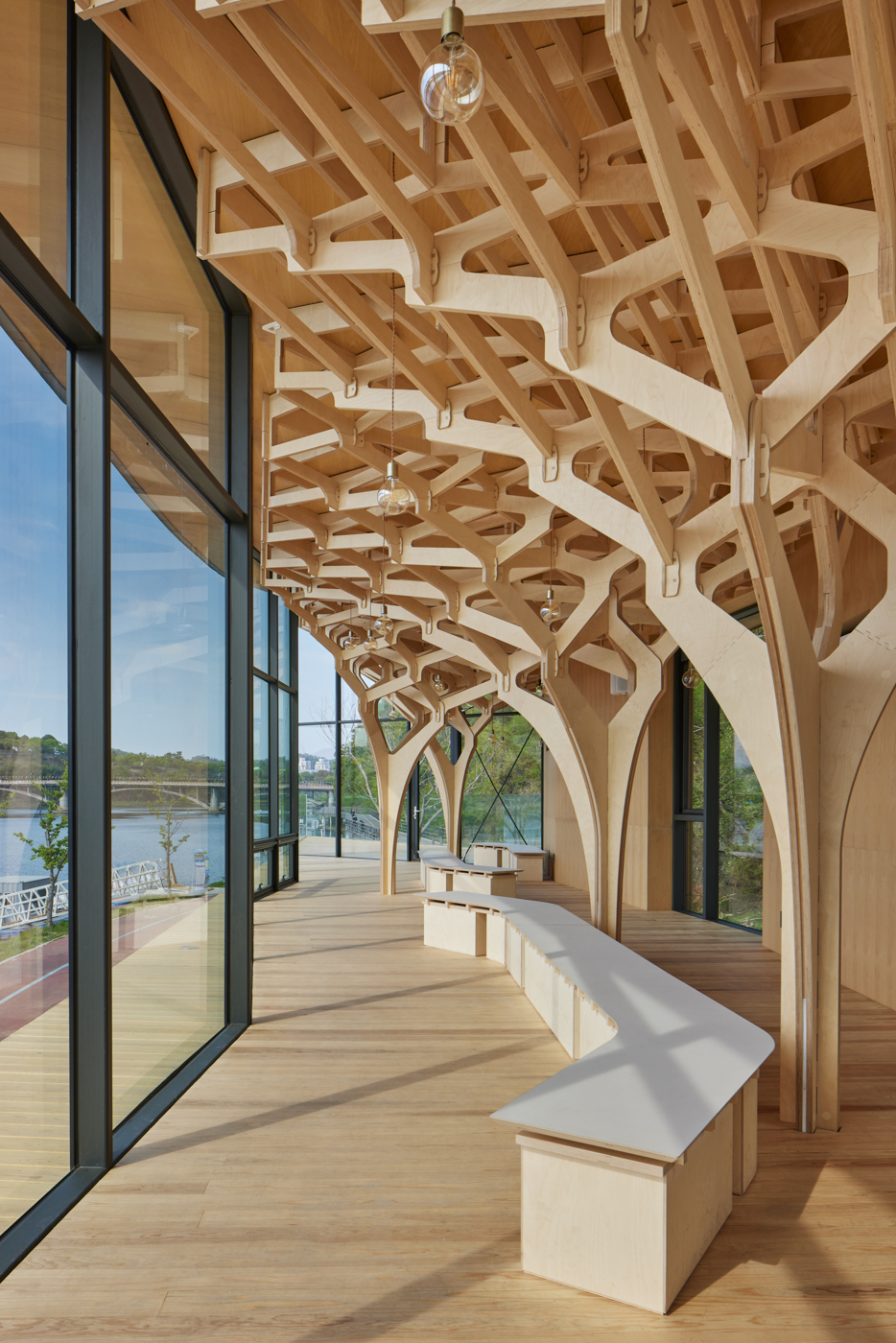 물빛나루쉼터는 전통 건축물인 촉석루에서 나타나는 목구조에 영감을 받아 현대적인 기술을 사용한 목구조를 창조했다. 전통 건축에서 기둥과 지붕을 연결하는 공포(栱包)와 같은 가구식 구조 결구는 정밀한 계산을 통해 ‘빛의 루’를 지탱하는 6개의 나무로 재탄생했다. 촉석루 전면 6개 기둥을 오마주한 ‘빛의 루’의 구조 결구는 못과 접착제의 사용을 최소화하고 나무 부재들의 결합만으로 이루어져 전통의 방식을 현대적으로 재현했다. 각각 다른 형태의 비표준화 부재들로 이루어진 복잡한 구조체는 3차원의 도면으로 이루어진 조립 매뉴얼을 통해 시공자의 이해도를 높일 수 있었고, 증강현실의 기술을 도입하여 효율적인 시공성을 고려했다. 이는 전통 건축에서 건축을 구현하는 방식에 최신의 기술을 적극적으로 접목하며 전통 목구조를 재탄생 시킬 수 있다는 가능성을 보여준다.