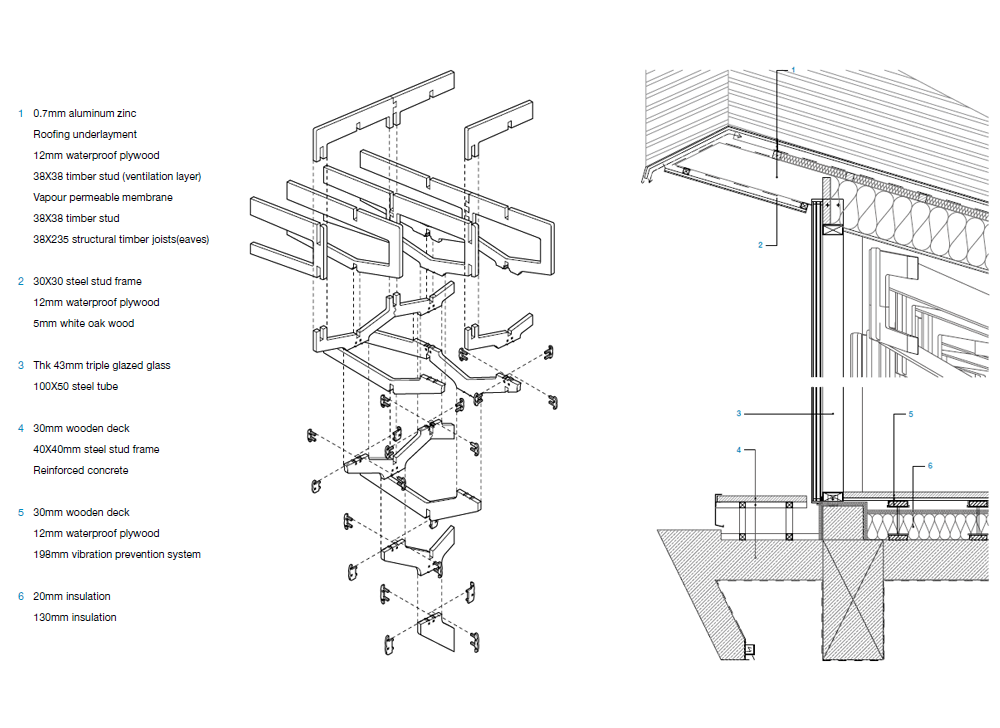 The Pavilion of Floating Lights was inspired by the wooden structure of Chokseok-ru, a traditional building, and a wooden structure was created using modern technology. A furniture-like structural frame that connects pillars and roofs in traditional architecture, was reimagined as six trees that support the Pavilion of Floating Lights through precise calculations. The structural frame of the Pavilion of Floating Lights, which pays homage to the six pillars in the front part of Chokseok-ru, minimizes the use of nails and adhesives and is made up of only wooden elements combined, which makes it a modern take on traditional methods. An assembly manual with three-dimensional drawings was prepared to help the builders’ understanding of the complex structure, which is composed of non-standardized elements of different shapes, and augmented reality technology was introduced for efficient construction. This demonstrates the possibility of regenerating traditional wooden structures by actively incorporating the latest technologies into the way traditional architecture is implemented.