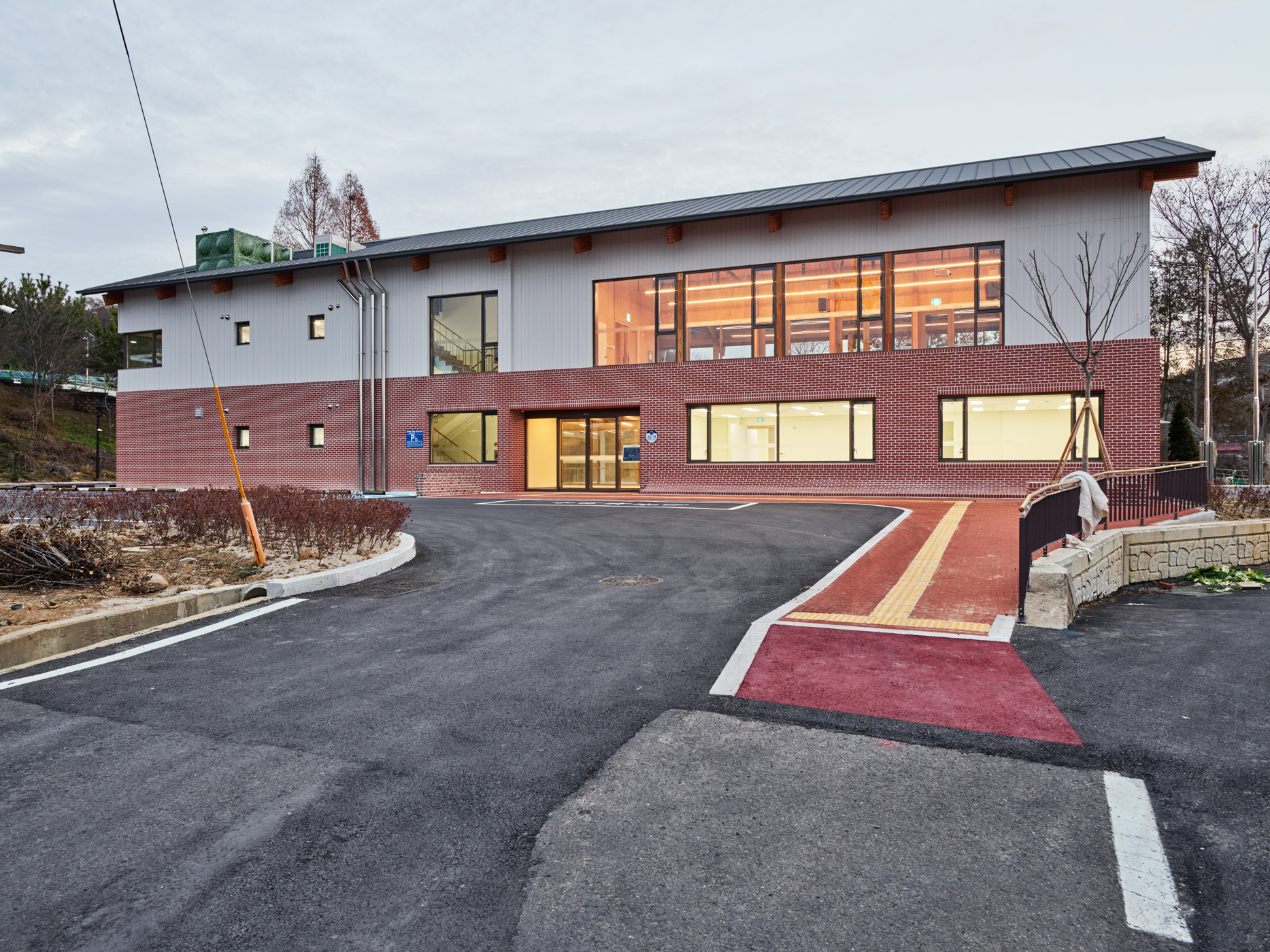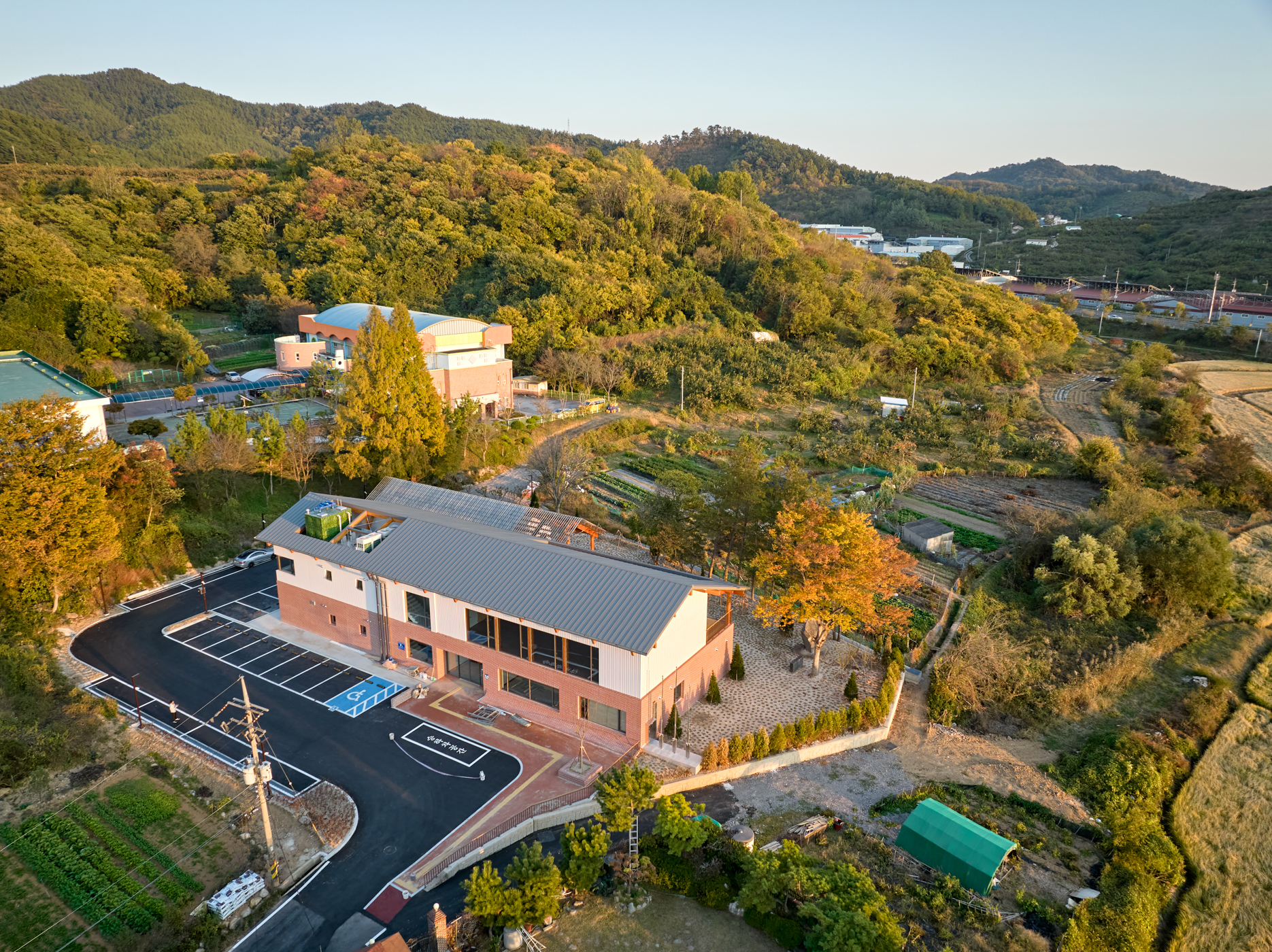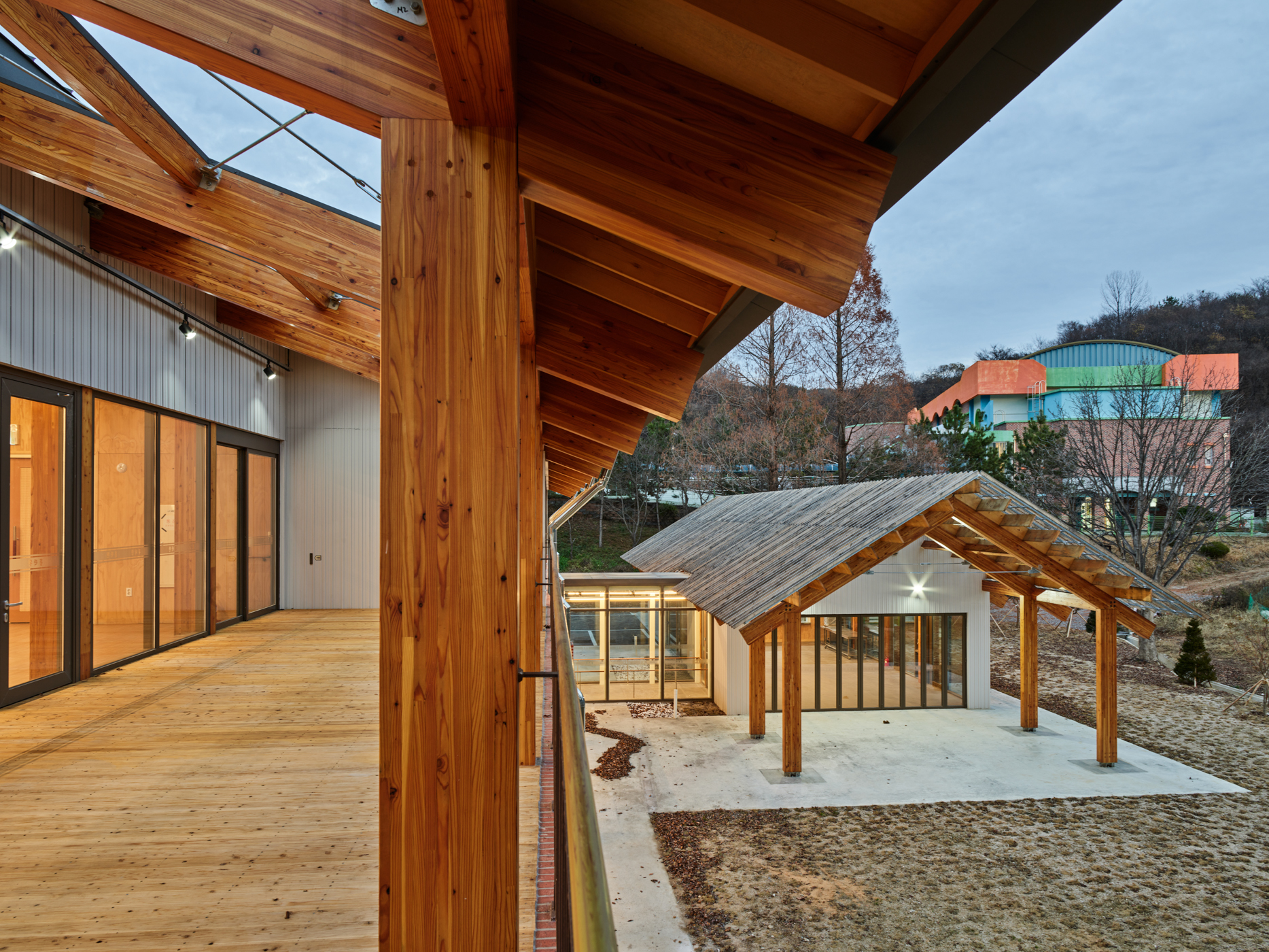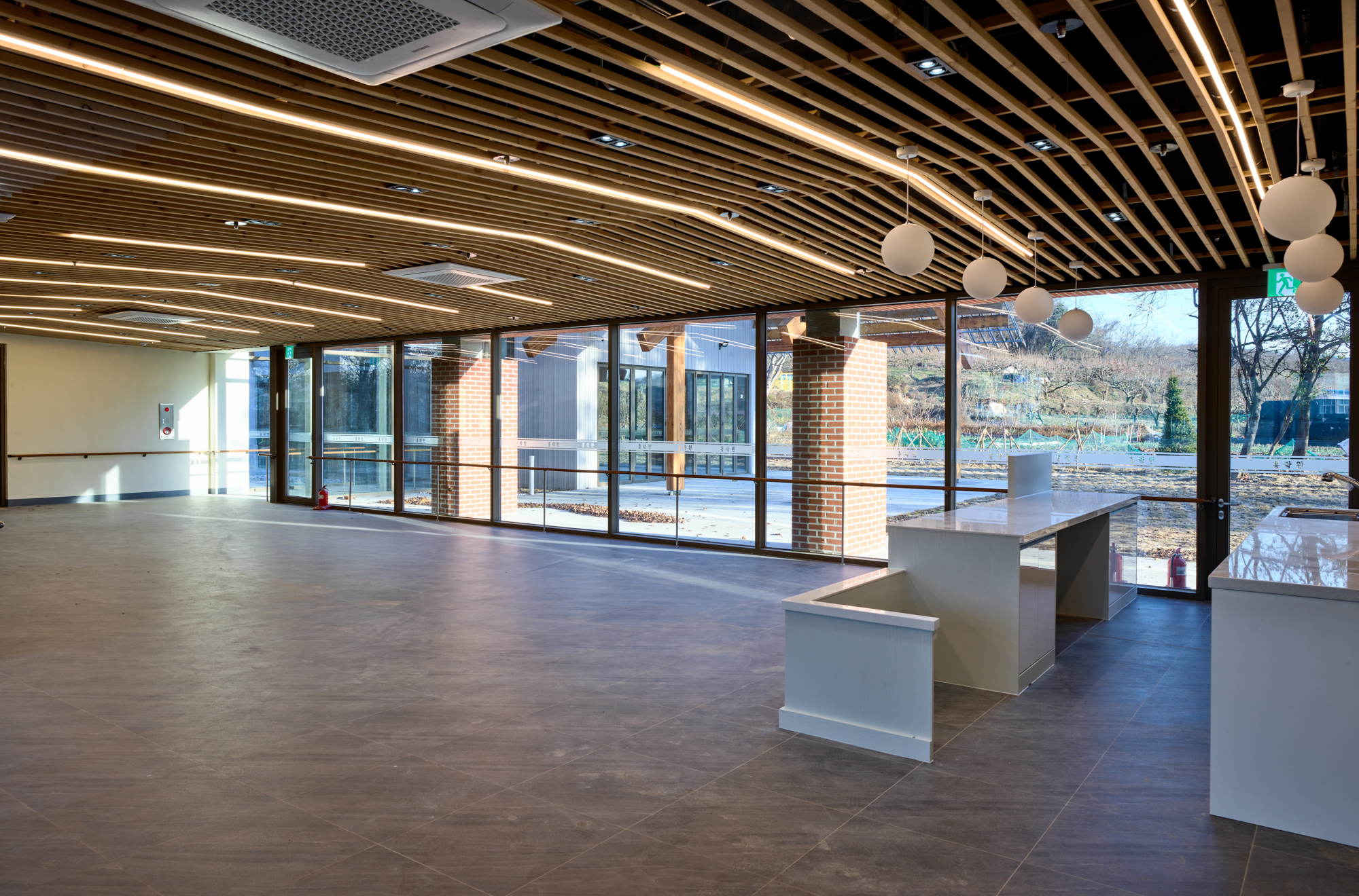 The site is located 500 meters south of the main city center and is adjacent to a road with vehicle access to the north. To the east of the site is Hyegwang School, and to the south and east are the terrains of Wolasan Mountain, allowing visitors to enjoy the natural scenery. The use of wooden structures reveals a formative beauty that blends in with this landscape. In the main building, the rafters are repeated in the interior, and on the outside, the wooden louvers are repeated on the roof of the dining hall. The exposed structural wood gives a sense of depth to the large space, promoting a sense of stability in the interior space at the human scale level. The use of wood in the interior space is a factor that enhances a sense of peace for facility users, and the energy-saving effect creates a comfortable indoor environment, enhancing sustainability in the eco-friendly sector.