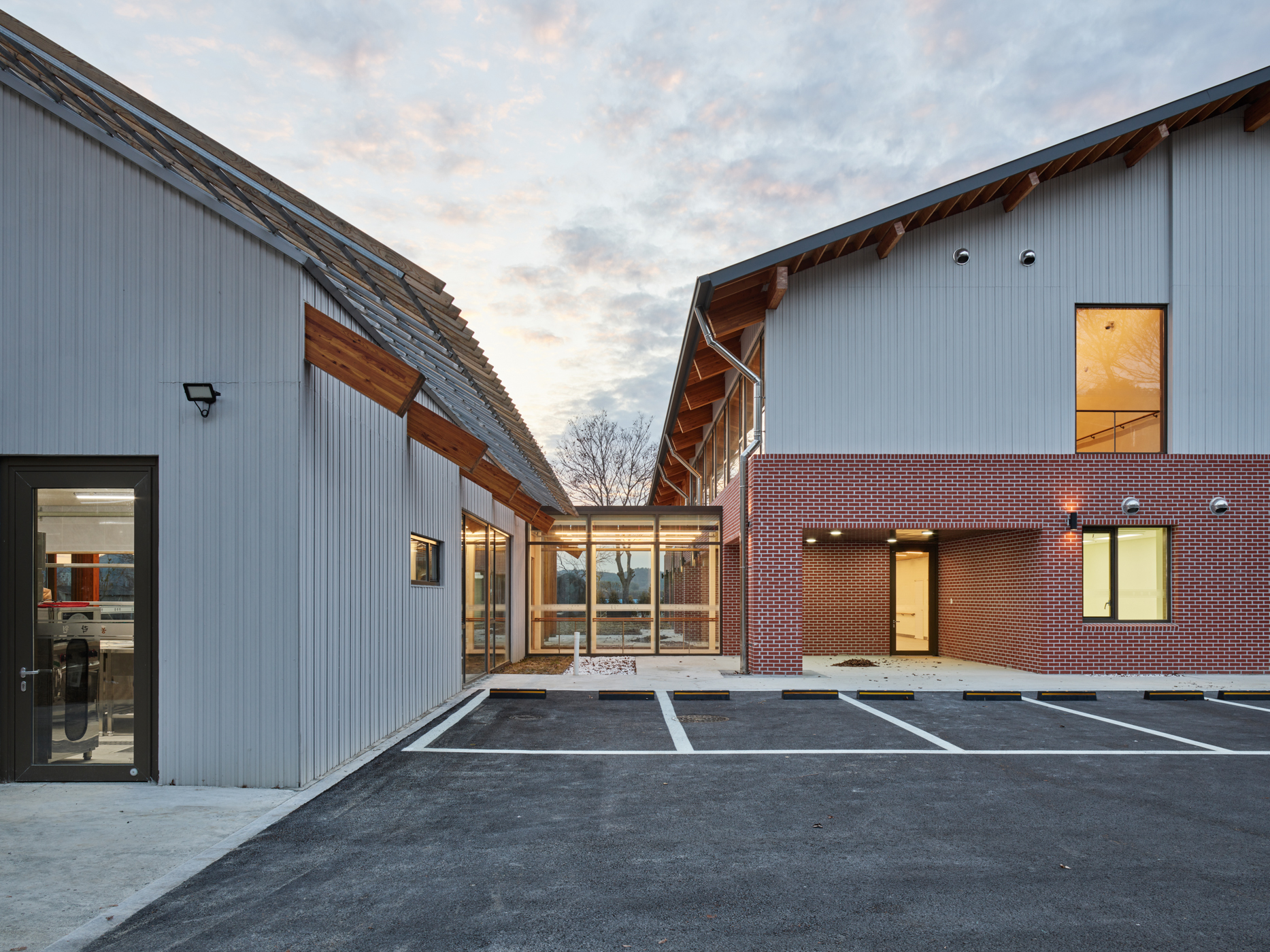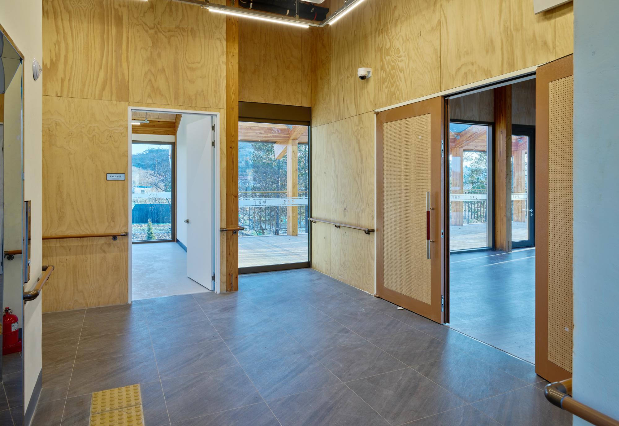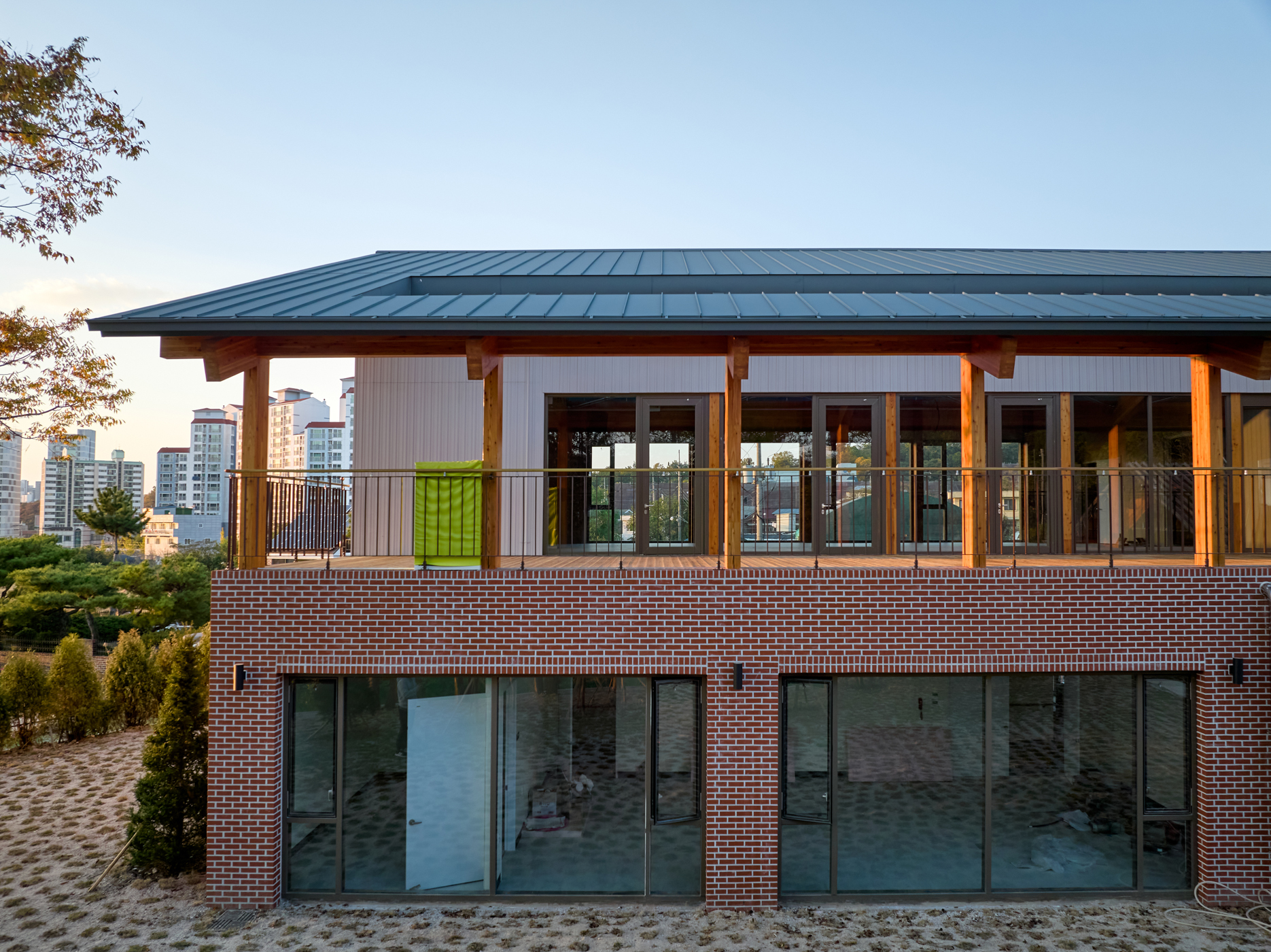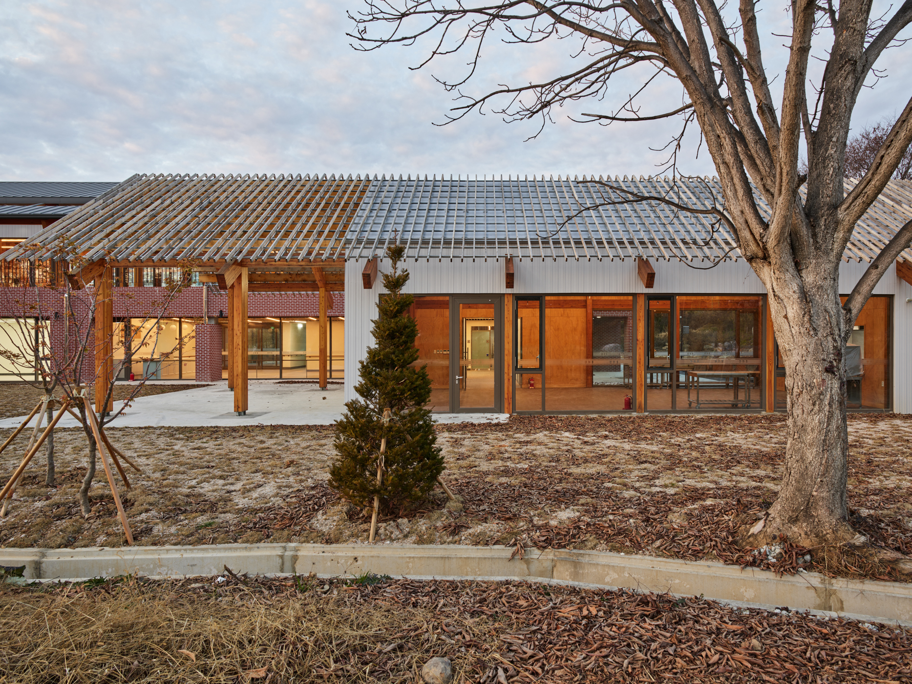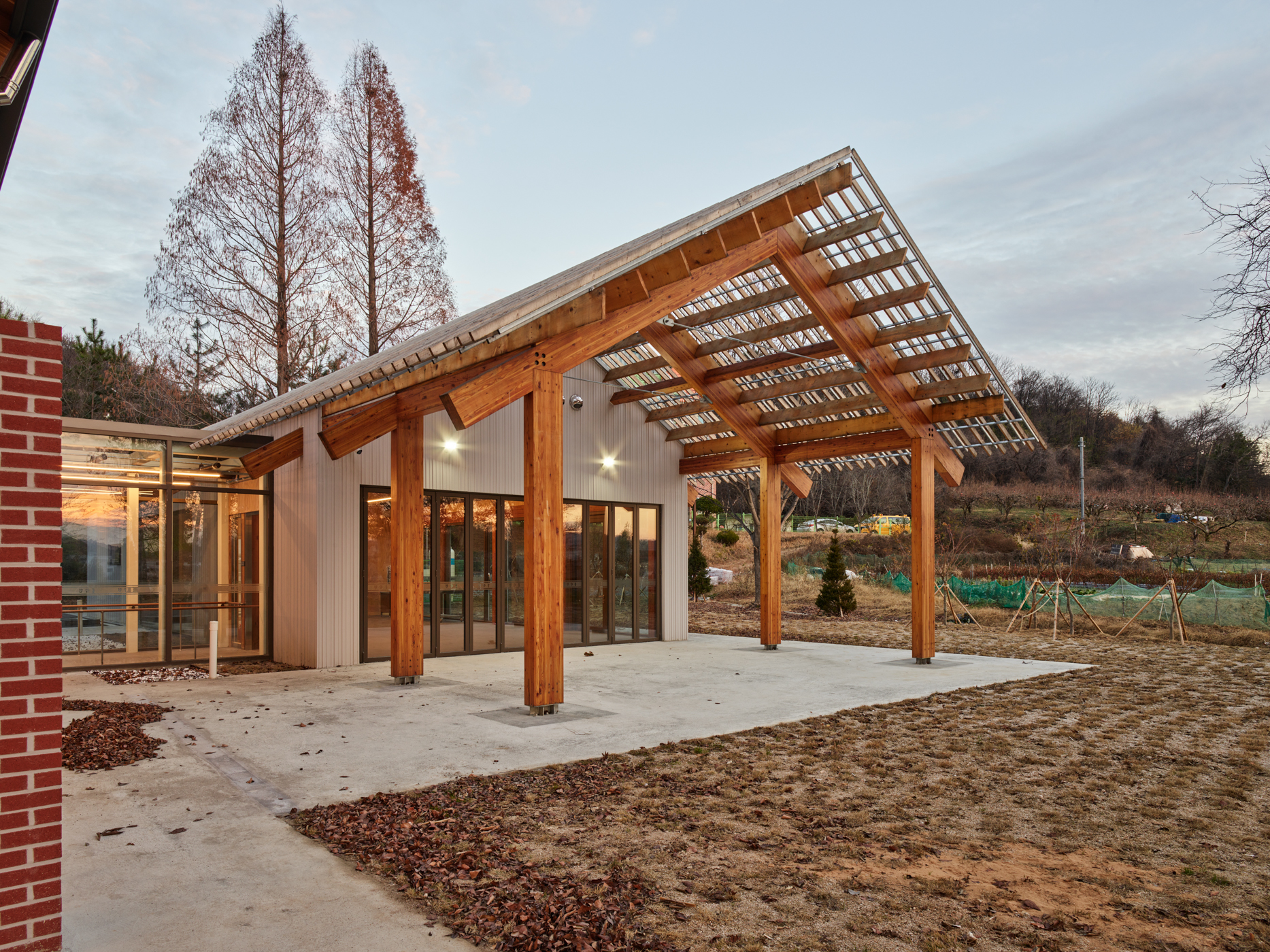 The site is located 500 meters south of the main city center and is adjacent to a road with vehicle access to the north. To the east of the site is Hyegwang School, and to the south and east are the terrains of Wolasan Mountain, allowing visitors to enjoy the natural scenery. The use of wooden structures reveals a formative beauty that blends in with this landscape. In the main building, the rafters are repeated in the interior, and on the outside, the wooden louvers are repeated on the roof of the dining hall. The exposed structural wood gives a sense of depth to the large space, promoting a sense of stability in the interior space at the human scale level. The use of wood in the interior space is a factor that enhances a sense of peace for facility users, and the energy-saving effect creates a comfortable indoor environment, enhancing sustainability in the eco-friendly sector.