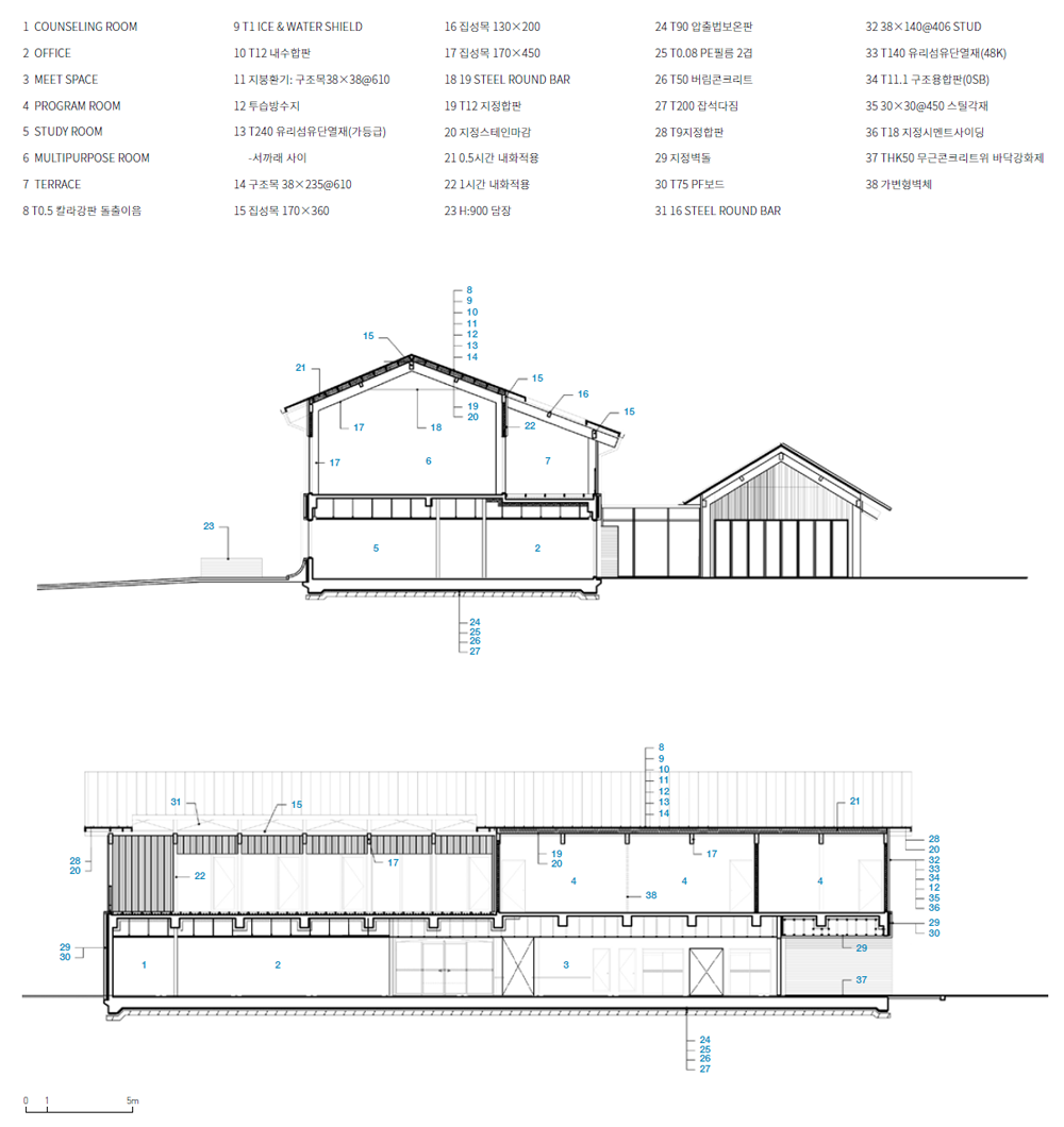 노인복지시설은 단순히 생활편의시설의 역할에서 그치는 것이 아니라 주민들이 주도하여 만들어가는 지역커뮤니티 시설이 되어야 한다. 주민 의견을 단순하게 수렴한 형태로는 미래의 변화가능성에 대응하는 공간을 만들기 어렵다. 건축가는 이런 점에서 착안하여 지속가능한 마을형 노인복지시설을 계획했다. 다층의 다채로운 마당과 실내 공간의 연결은 복합적인 프로그램과 공간 사용 가능성을 포용하는 구조적인 요소가 된다.