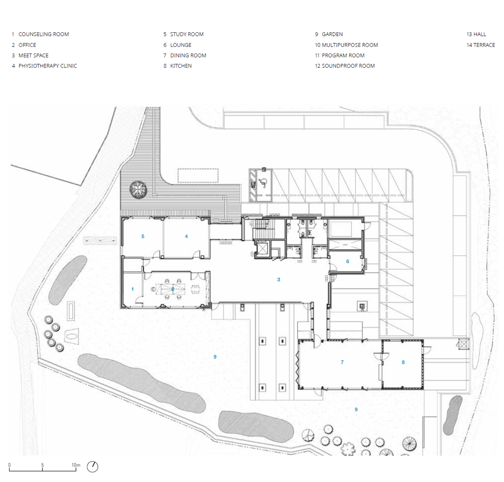 Senior welfare facilities should not simply serve as neighborhood facilities, but should become local community facilities led by residents. It is difficult to create a space that responds to the possibility of future changes by simply collecting residents’ opinions. With this in mind, the architects planned a sustainable village-type senior welfare facility. The connection between the multi-level, lively yards and the indoor space becomes a structural element that embraces the possibility of complex programs and uses of space.