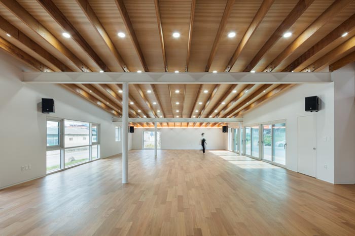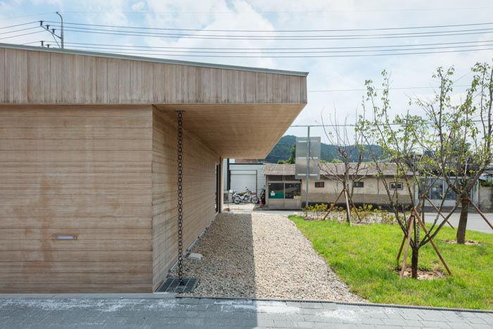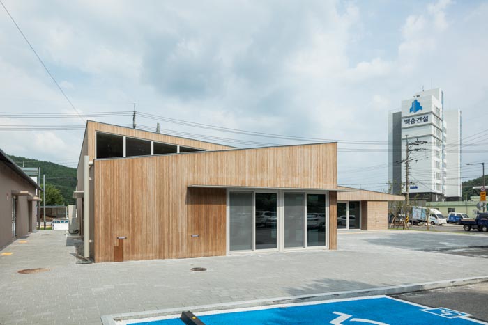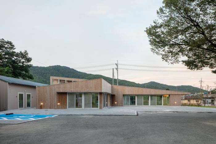 The new cultural center building located at the entrance of the site complements the accessibility of the existing myeon office[1], reducing psychological and physical barriers. The shape of the sloping roof extending from the first to the second floor and the exposed wooden structure of the interior space are physical elements that reduce access barriers. A multi-purpose program room and a common kitchen on the first floor increase residents’ access to culture, while the open space outside provides a place for all residents to relax and engage in activities with other nearby spaces. To reestablish order in the space, the design has clear separation between pedestrians and vehicles. Previously, there was always an inherent risk for pedestrians with disabilities due to the mix of pedestrian and vehicular parking and movement. In order to improve this, the architects maintained the number of parking spaces outside the building while providing a pedestrian-only passageway to maximize accessibility as a public building.