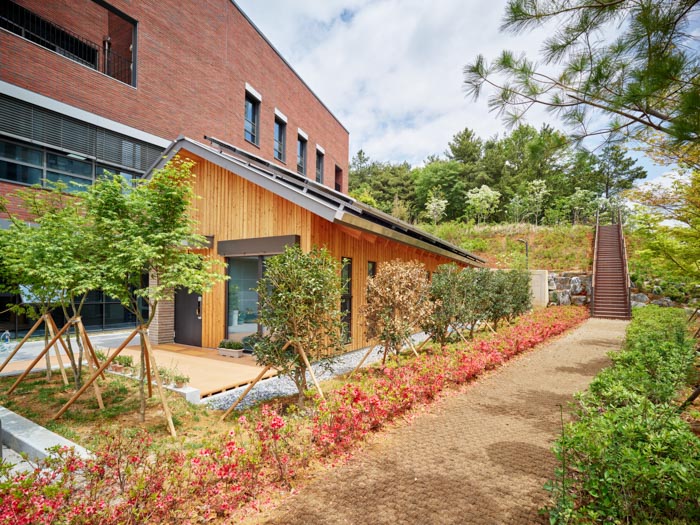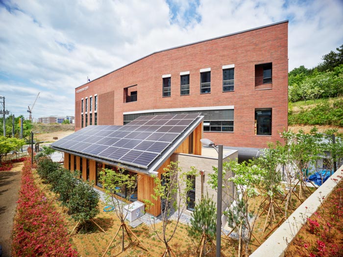 Jinju Dolbom Flower Shop (community care platform), planned as one of the community business facilities within the Gaho-dong Administrative Welfare Center, was carried out as an ecological building demonstration project of the Korea Institute of Civil Engineering and Building Technology through a business agreement with Jinju City. A wooden structure was applied to realize eco-friendly, low-carbon architecture, and many eco-friendly ecological building techniques, such as wooden panelizing using domestic larch, were applied with the goal of becoming Korea’s first carbon-neutral public building. Elements such as a floor system using eco-concrete and foamed glass aggregate insulation, an exterior wall using wood fiber insulation SIPs, and interior walls and interiors using natural non-fired earth and wood are used for the goal of realizing a zero-carbon building.