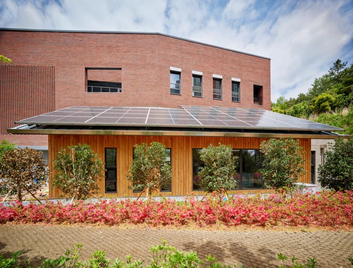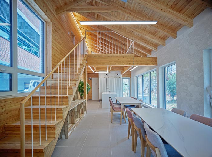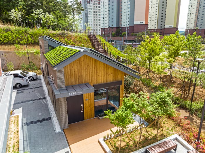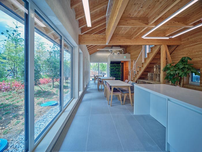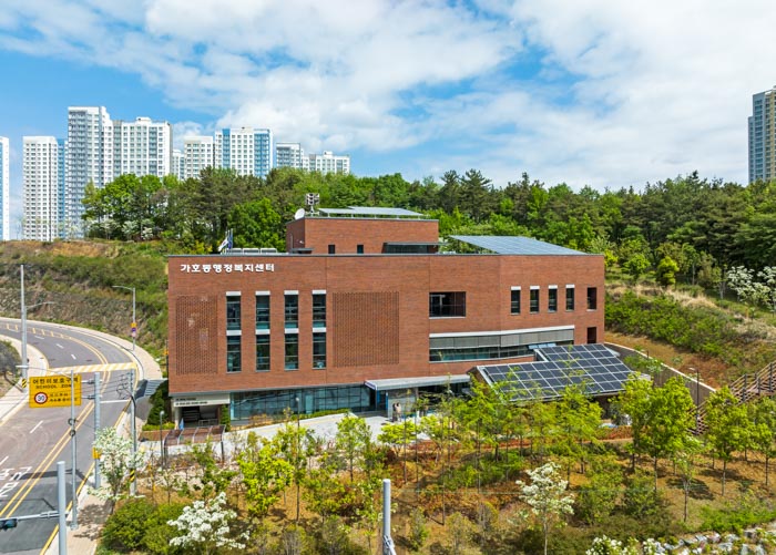 Jinju Dolbom Flower Shop (community care platform), planned as one of the community business facilities within the Gaho-dong Administrative Welfare Center, was carried out as an ecological building demonstration project of the Korea Institute of Civil Engineering and Building Technology through a business agreement with Jinju City. A wooden structure was applied to realize eco-friendly, low-carbon architecture, and many eco-friendly ecological building techniques, such as wooden panelizing using domestic larch, were applied with the goal of becoming Korea’s first carbon-neutral public building. Elements such as a floor system using eco-concrete and foamed glass aggregate insulation, an exterior wall using wood fiber insulation SIPs, and interior walls and interiors using natural non-fired earth and wood are used for the goal of realizing a zero-carbon building.