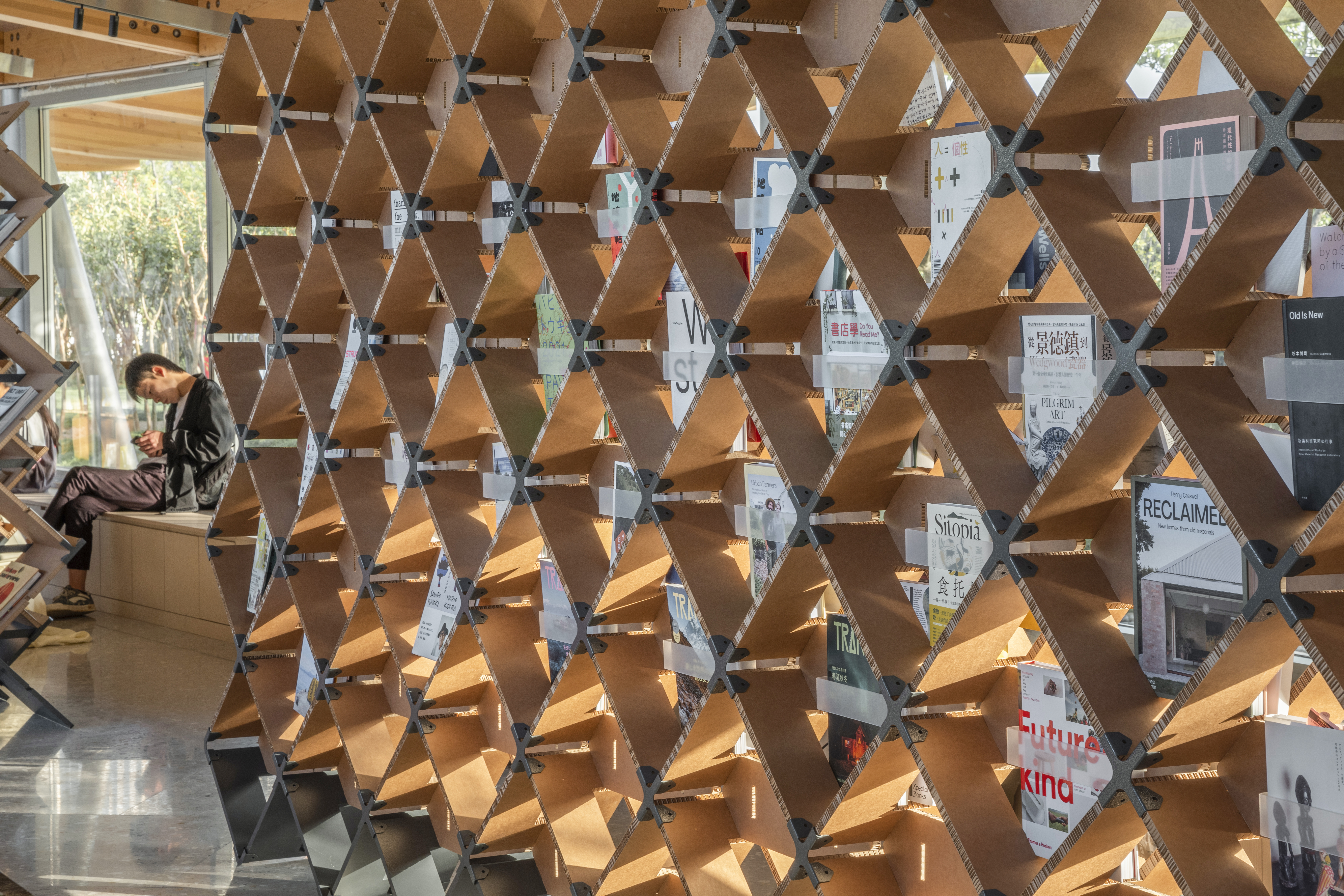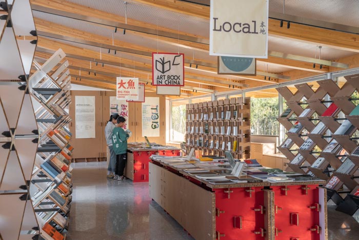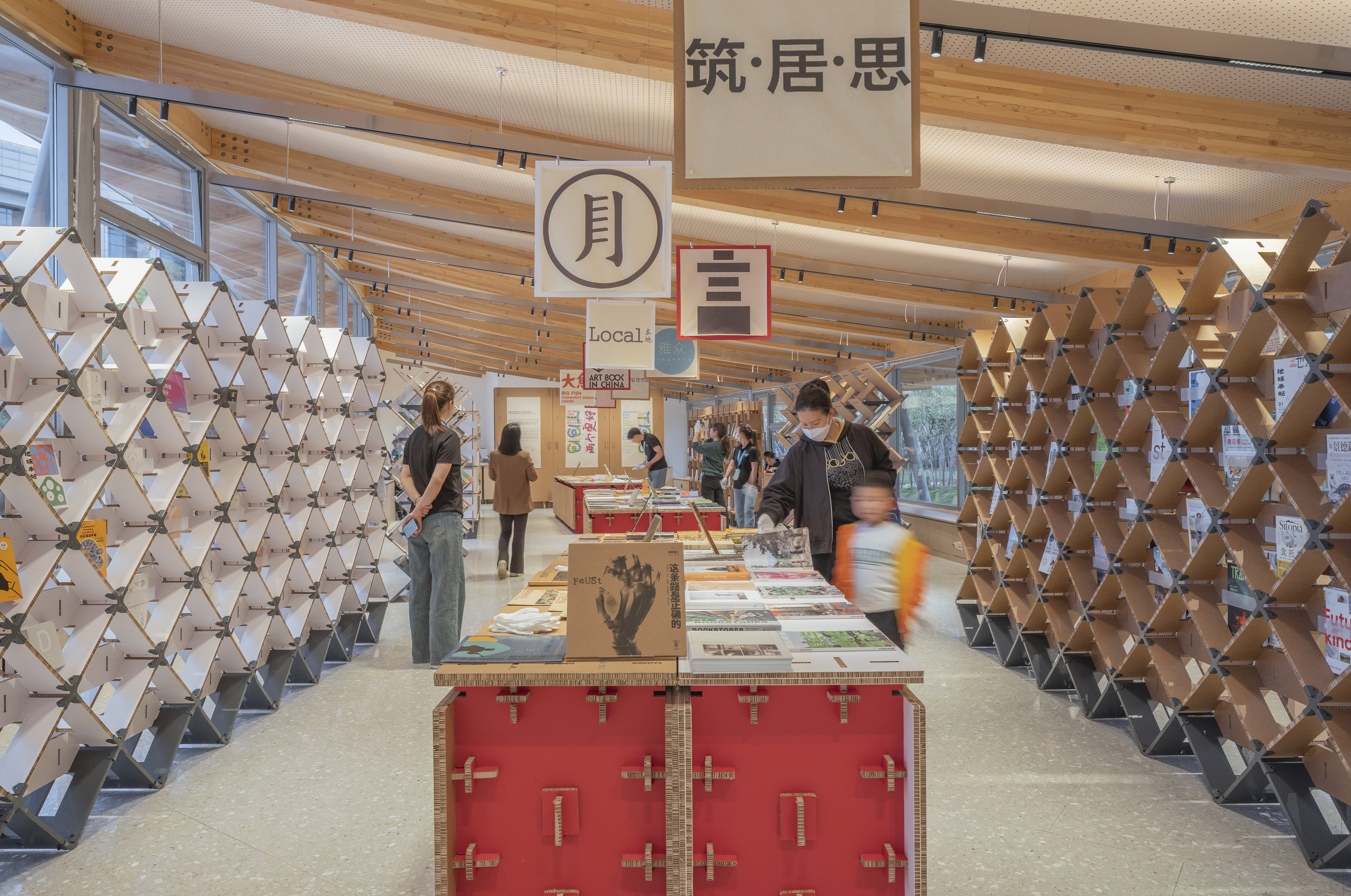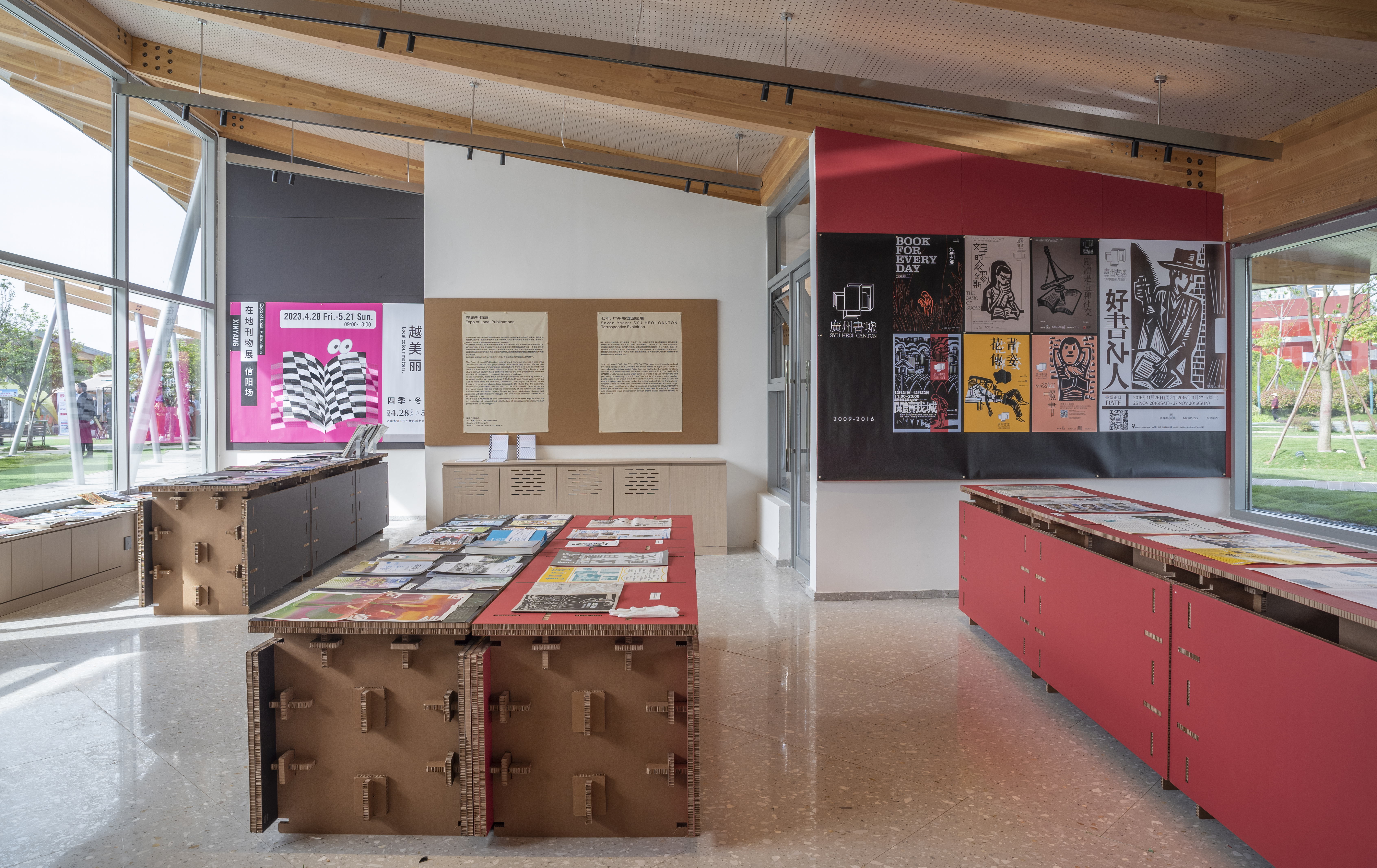 Continuing from last year, Luo Studio designed the space for Zuo Jing’s ‘Xinyang Book Market: Books 'N Tea’ exhibition, utilizing recyclable corrugated cardboard structures. This exhibition was held in the Autumn Bookhouse and Winter Bookhouse designed by Atelier Liu Yuyang Architects. The buildings used for the exhibition are small, fan-shaped buildings that are independent spaces sharing a roof. The architects had to create exhibition spaces for 18 independent booksellers, each with a different concept, in the south wing of the building, which was dedicated to exhibitions. In order to give each bookstore an independent display space for their books, the display shelves were efficiently arranged in parallel, and the assembly was varied according to the type, size, and weight of the books. The various images for display had their corners nailed to corrugated cardboard walls, thus increasing the reusability of the cardboard after the exhibition. In particular, in addition to the existing light brown corrugated cardboard, several newly developed corrugated cardboard types in red, black, and white were introduced, providing various possibilities and atmospheres for exhibition spaces using corrugated cardboard