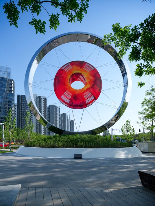 Wangjing used to be a vast agricultural area located northeast of Beijing, and with its advantageous location, it is a city that has grown rapidly over the past 20 years through transportation, technology, fashion, international business, and social activities. The designers proposed a modern interpretation of ‘WangJing,’ which literally means ‘look out to the imperial city’ as a new landmark in the cosmopolitan Wangjing district. Installed at a major intersection in downtown Wangjing, Colorful WangJing is centrally located within the center of the city. Through the abstract image of an “eye” looking out over the area, it symbolizes the harmony between future urban development and daily life.