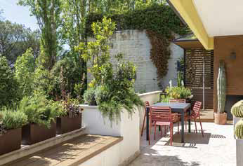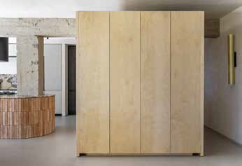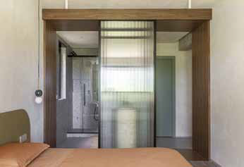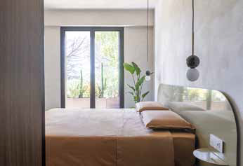 In Tor de’ Cenci, a southern suburb of Rome, is an apartment that overlooks the Castel Porziano Natural Reserve. A young lawyer couple commissioned the renovation to create a new living space with a terrace where they could relax and enjoy the abundance of natural light. Rude House stimulates the tactile experience of architecture by harmoniously mixing various colors, moods, and textures. Clean, elegant lines that separate the living areas from the study, are balanced by exposed and existing structures, such as the terracotta and perforated brick walls in the kitchen. In the living space is an unfinished wall that visually connects the entrance, living room, dining room, and kitchen with the exposed concrete support structure. The terrace stretches along the entire southwest side of the apartment, offering breathtaking sunset views. The external masonry kitchen, covered in travertine that occupies the existing threshold, is integrated into the parquet and the bench that serve as seating for the dining table, while the horizontal surfaces are covered with wooden slats. The louver sun shade system protects the privacy of the bedroom and blurs the boundary between the inside and outside.