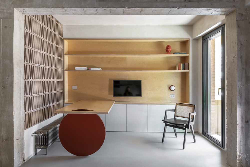 In Tor de’ Cenci, a southern suburb of Rome, is an apartment that overlooks the Castel Porziano Natural Reserve. A young lawyer couple commissioned the renovation to create a new living space with a terrace where they could relax and enjoy the abundance of natural light. Rude House stimulates the tactile experience of architecture by harmoniously mixing various colors, moods, and textures. Clean, elegant lines that separate the living areas from the study, are balanced by exposed and existing structures, such as the terracotta and perforated brick walls in the kitchen. In the living space is an unfinished wall that visually connects the entrance, living room, dining room, and kitchen with the exposed concrete support structure. The terrace stretches along the entire southwest side of the apartment, offering breathtaking sunset views. The external masonry kitchen, covered in travertine that occupies the existing threshold, is integrated into the parquet and the bench that serve as seating for the dining table, while the horizontal surfaces are covered with wooden slats. The louver sun shade system protects the privacy of the bedroom and blurs the boundary between the inside and outside.