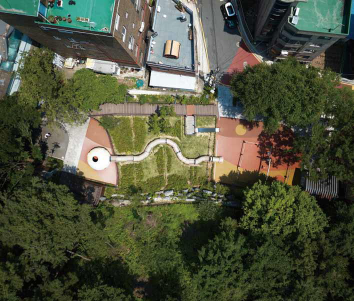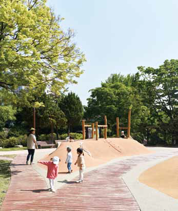 For Wonseo Park playground, the architects created a central space around a protected locust tree that symbolizes the long history of Jongno-gu, and proposed a land art design, setting the roots of the tree as the design motif. Through land art design the design concept, distancing and securing space between play areas, and stepless play areas can be realized without removing the trees growing in the shallow soil at the top of the existing parking lot.