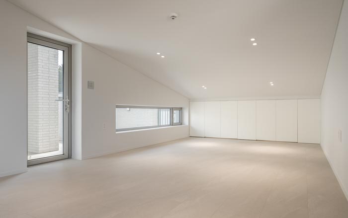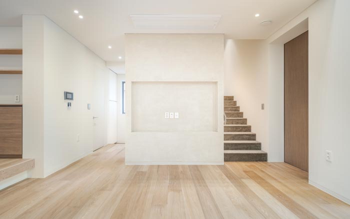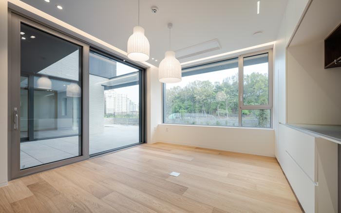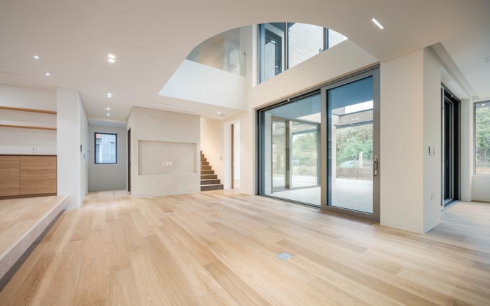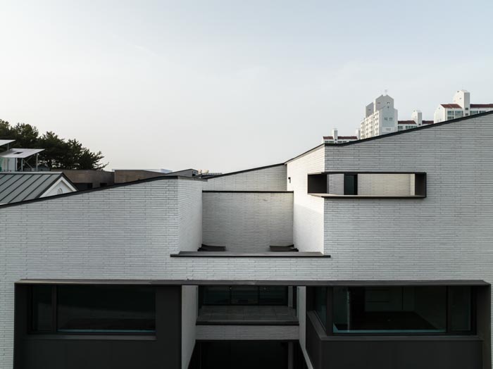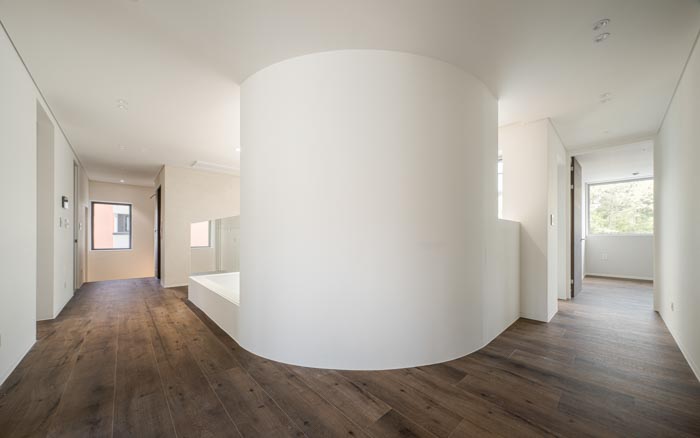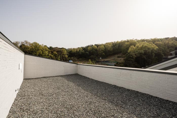 The courtyard on the south side faces the living, dining, and multipurpose rooms due to its 'U' shape, and serves as a visual extension of each room. The couple's and child's bedrooms are located on the second floor, and the separated masses are connected through the borders of the elevation. The living room, which faces the courtyard and main hall, has openings on two levels to maximize openness and light. The soft curved surface of the second floor, which faces the opening, creates a natural circulation and changes the space. The kitchen, adjacent to the living room and dining room, allows for conversation with the children while cooking. The cozy dining room draws the good scenery of the south side into the room. In consideration of the children, the plan has no steps and includes a wide corridor and elevator. The attic space leads to two rooftop terraces. The sky terrace sectioned by high walls, which is open to the sky, and the crushed stone yard, which is open to the outside scenery, is a place of rest and gathering for the family.