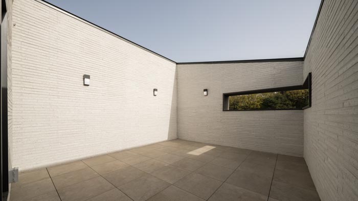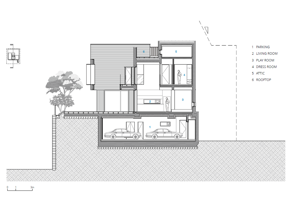 The site is located at the southernmost part of a detached house complex surrounded by low foothills in the east, facing a vegetable garden and low mountains. The main rooms with large windows are located on the south side, which has a good view and good light, creating a pleasant living environment. The building is set one floor higher than the road, allowing vehicles to enter the basement directly from the road on the north side. The number and size of windows on the side facing the road were reduced to protect privacy and save energy, and a ventilation window was installed to allow ventilation on the south side.