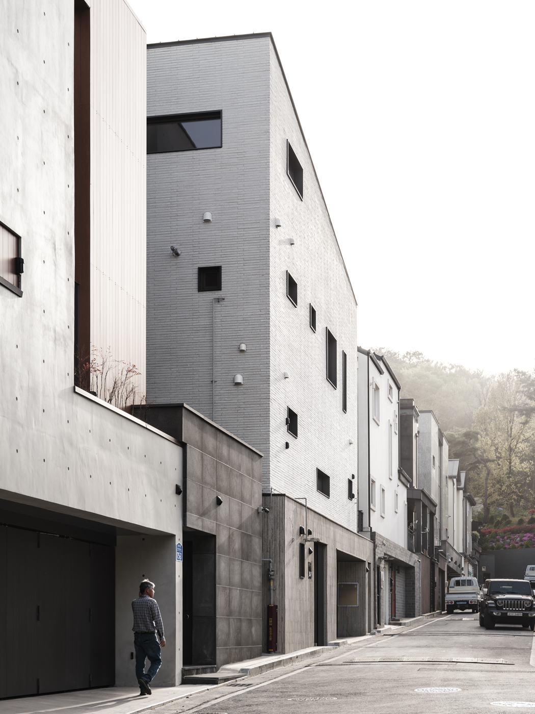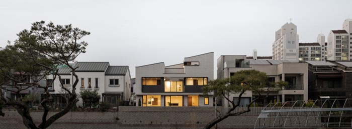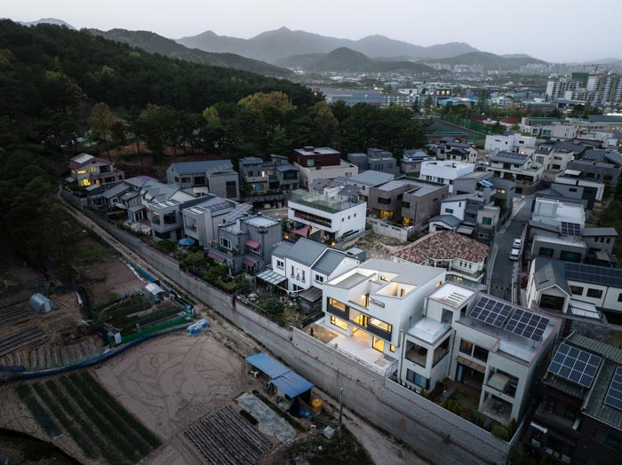 대지는 동쪽의 낮은 산자락에 둘러싸인 단독주택 단지의 가장 남측에 자리하며 텃밭과 낮은 산을 마주한다. 경관이 수려하고 채광이 좋은 남측에 큰 창을 가진 주요 실을 배치하여 쾌적한 생활 환경을 조성하였다. 건물은 도로보다 한 개 층 더 높게 조성하여 북측의 도로에서 지하층으로 차량이 직접 진입할 수 있다. 도로 측에서의 사생활 보호와 에너지 절약을 위해 창호의 수와 크기를 줄이되 남측과 맞통풍이 가능하도록 환기창을 설치하였다.