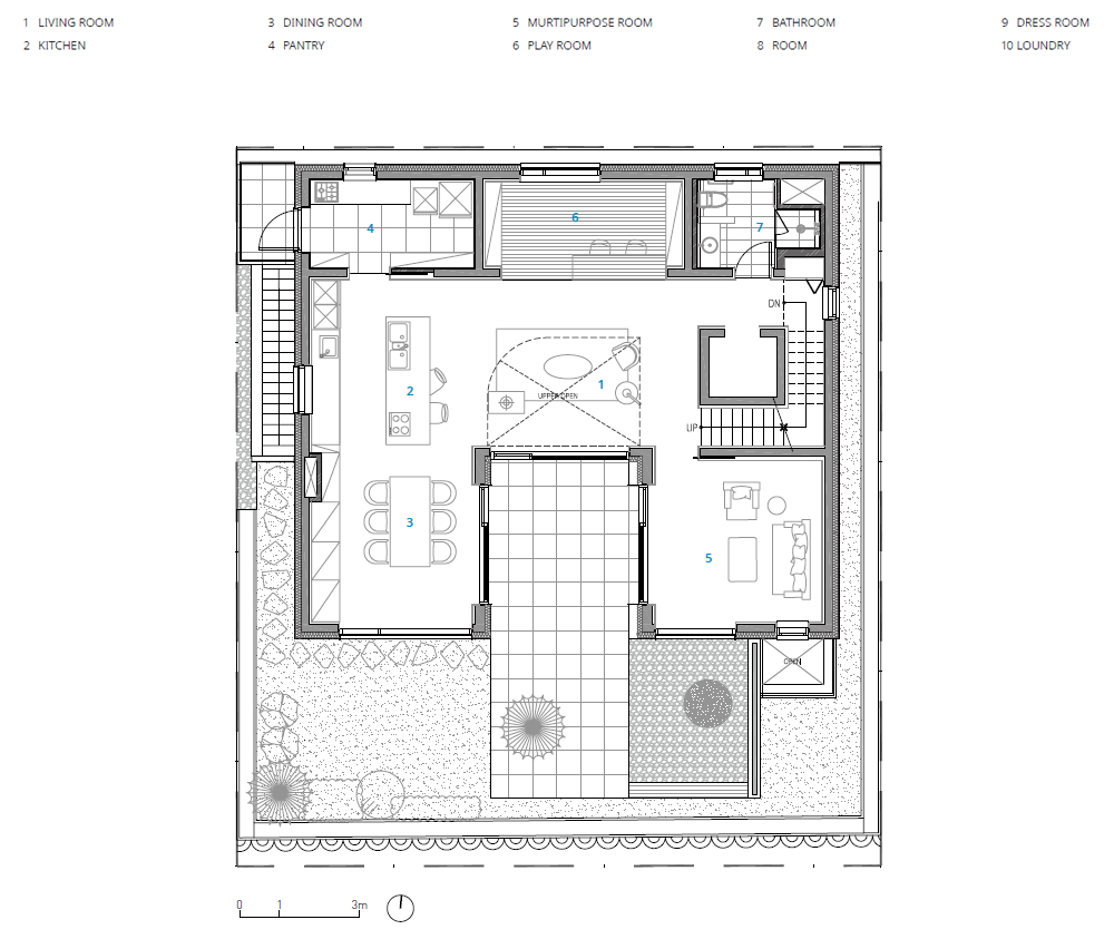 남측에 설치된 중정은형태의 배치로 인해 거실과 다이닝, 다목적실에 면하고 있으며 시각적으로 각 실이 확장되는 역할을 한다. 2층에는 부부와 아이의 침실을 배치했고, 입면의 테두리를 통해 분리된 매스를 연결했다. 중정과 정면으로 향하는 거실은 두 개 층의 오프닝을 통해 개방감과 채광을 극대화했다. 오프닝에 면해 설치된 2층의 부드러운 곡면은 동선을 자연스럽게 유도하고 공간에 변화를 준다. 거실과 다이닝에 인접한 주방에서는 요리하며 아이들과 대화할 수 있다. 아늑한 다이닝은 남측의 좋은 경관을 실내로 끌어 들인다. 또한 아이들을 위해 동선상 내부 단차가 없도록 계획하였고 넓은 복도와 엘리베이터를 적용하였다. 다락 공간은 두 개의 옥상마당으로 연결된다. 높은 벽으로 구획되어 하늘로 열린 하늘마당과 외부의 경관을 향해 열려 있는 쇄석마당은 가족에게 쉼과 모임의 장소가 된다.