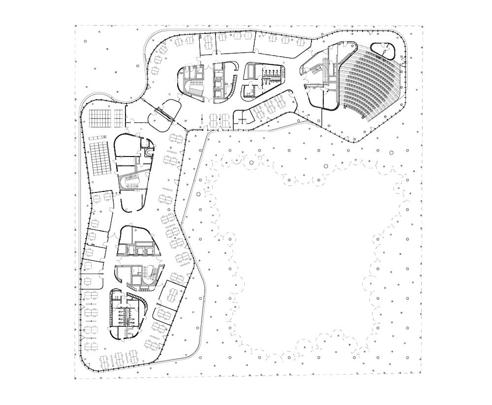 컨퍼런스 센터, 미팅룸, 레스토랑을 포함한 새로운 본사는 직원의 희망 사항을 반영하여 오픈 형태의 플렉스 오피스, 싱크 탱크, 미팅룸 등 다양한 모듈을 활용한 현대적이고 유연한 업무 공간으로 계획했다. 지역 사회에 공헌하는 에스에이비 은행의 이념을 강조하기 위해 대지의 절반인 한 블록을 공공 공간으로 계획하여 주민들이 오갈 수 있도록 제안하였다. 이는 바로크 시대에 기존 대지에 있던 정원인 ‘뢰르스 가르텐’을 오마주한 공간으로 숲과 같은 칼럼 가든, 거대한 중앙 오프닝과 조경, 벤치와 미러 연못을 통해 복잡한 도시에서 주민들이 잠시 숨을 돌리는 휴식처가 된다.
