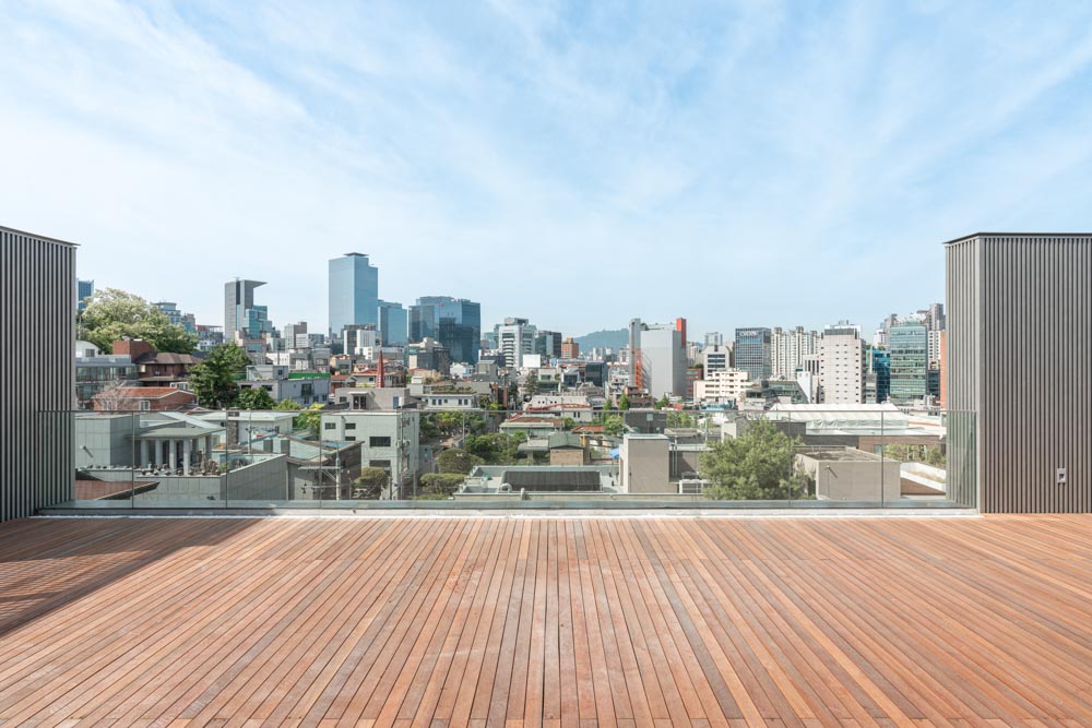 The wall shows an edited landscape that changes depending on the user’s location, and different shadows are cast depending on the time of day, creating a screen that feels unfamiliar. The architects wanted it to be a ‘wall of admiration’ where one can rest their gaze within moments of daily life, rather than a boring wall to face during work hours. The most important filming studio is located on the second basement level for large space and high floor height. Three sunkens were boldly arranged crosswise in the underground space to bring in light and create a comfortable, energy-efficient environment with natural ventilation. The stairs serve as an access to the parking lot adjacent to the street and the building that sits in the space between the sunken levels. They are open on both sides, making it feel like walking on air. An observation deck with a view of the Seoul skyline at the end of the staircase and a spacious deck provide an extraordinary sense of relaxation amidst the panoramic landscape.