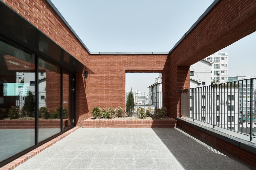 The client, for whom this area was the center of life for a long time, wanted a building that combined a residential space for a family of five, a gosiwon[1], and an office. The leasable area of the detached house was maximized by using only one, the seventh, floor, and a large terrace was planned on the eighth floor to realize the client’s dream home. Instead of a typical tiny gosiwon, the size of the space and windows were maximized to improve the quality of light and ventilation in the living space and create a pleasant environment.