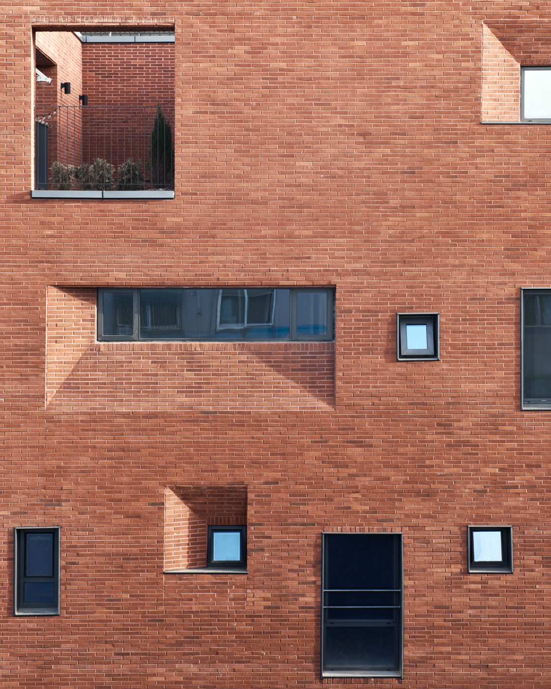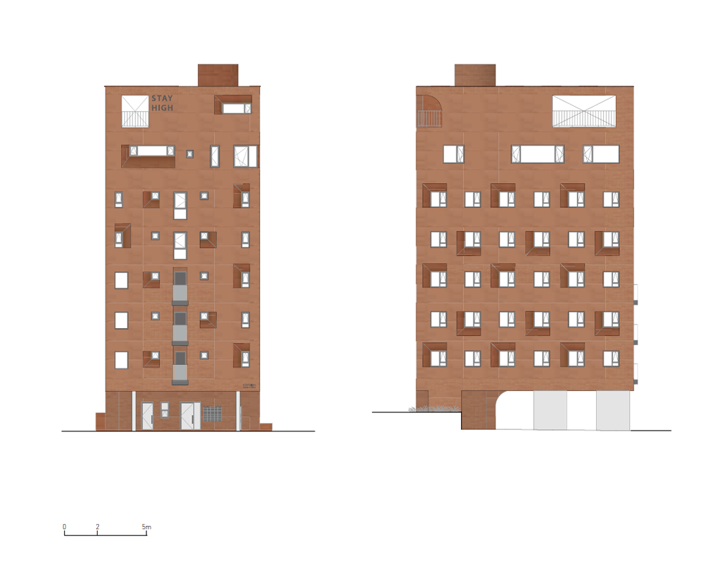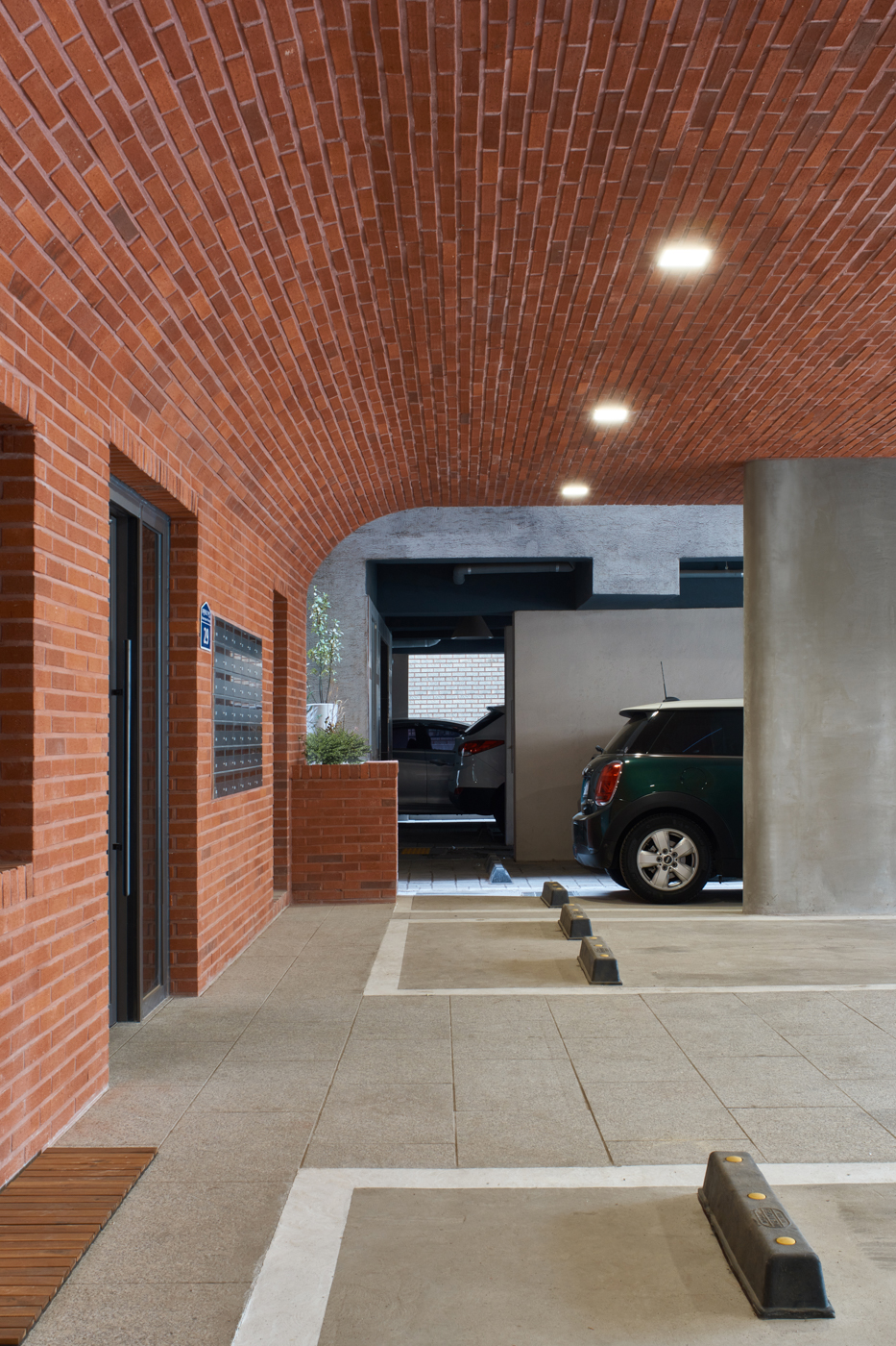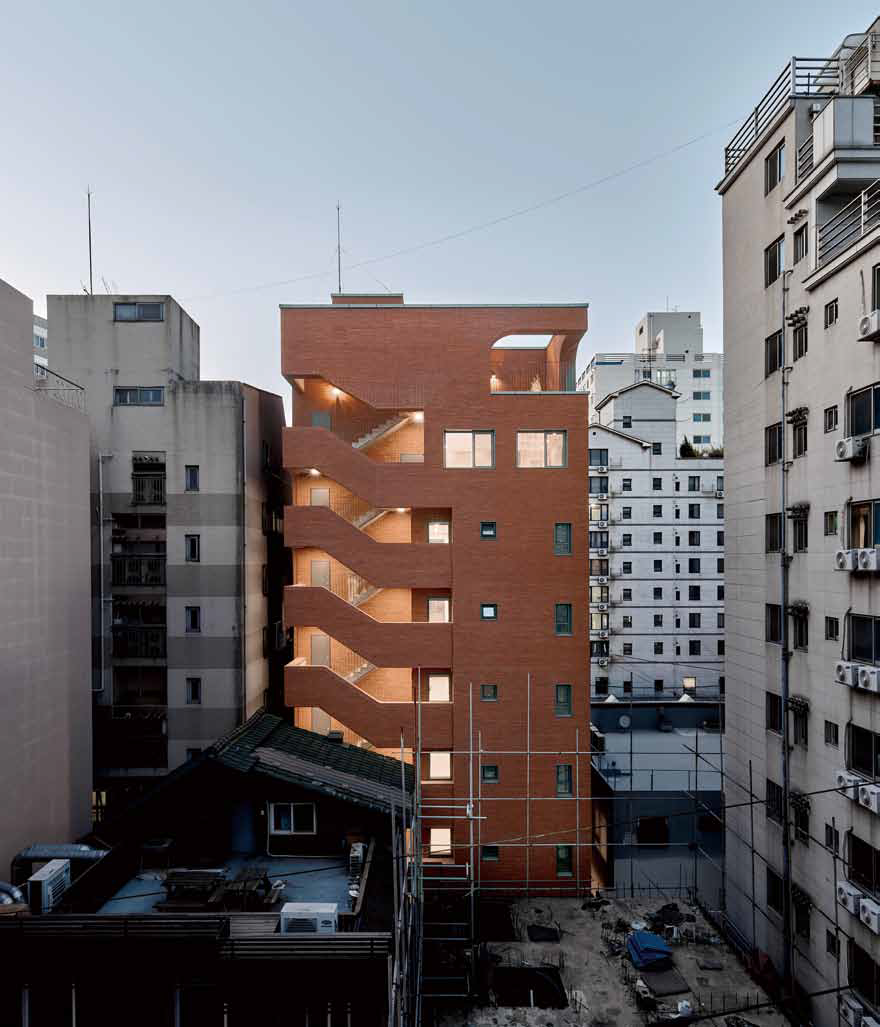 To solve the problem of height restrictions, a flat slab structure was used to create a comfortable ceiling height for the eight-story building. Also, an external staircase was planned as the direct staircase to secure additional total floor area while utilizing it as a design element. The entire building was planned in the form of a simple mass that maintained consistency by using a single material, but some openings in the elevation, folded elevation patterns, and the external stairs give the design originality. In particular, light burgundy was chosen as the color for bricks, the finishing material for the exterior, adding color to the otherwise neutral city and revitalizing it. We hope that this design attempt will become a milestone for change in the old city center.