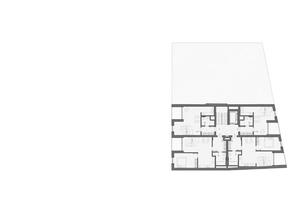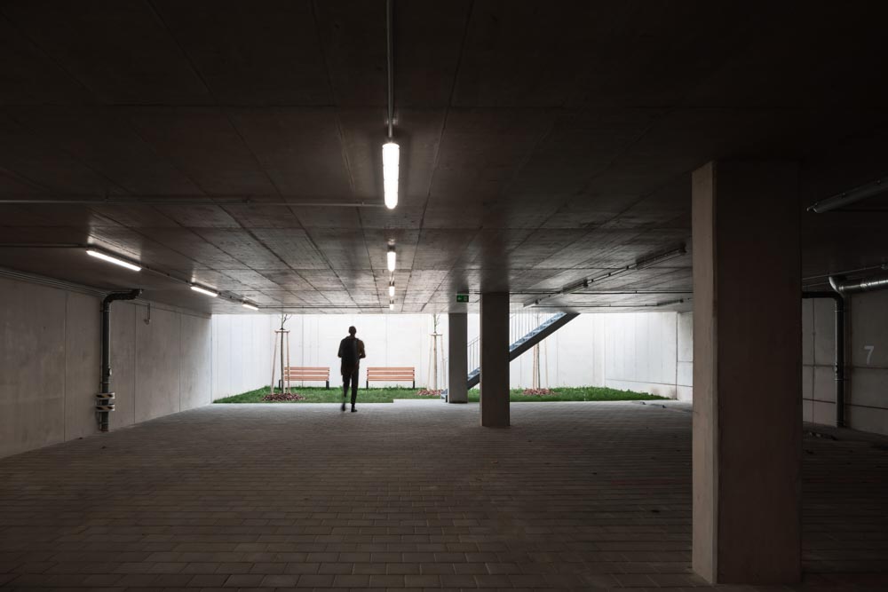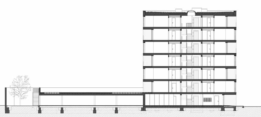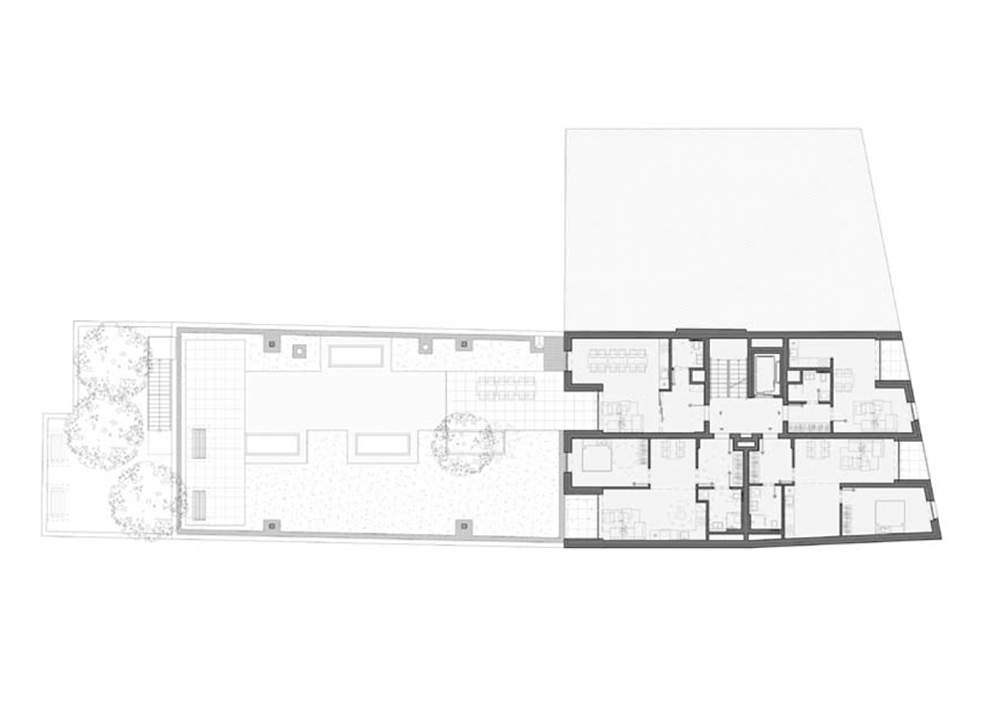 거동이 불편한 취약 계층을 위한 배리어 프리 계획은 프로젝트의 주요 요소다. 3층부터 7층까지 이어지는 주거 공간 중 파티오에 면한 넓은 유닛은 거동이 불편한 입주민들을 위해 계획했다. 최상층과 차고는 녹화 계획을 적용한 평지붕으로, 이곳에서 모인 우수는 지하의 탱크에 저장한 후 옥상정원의 관개로 재활용한다.