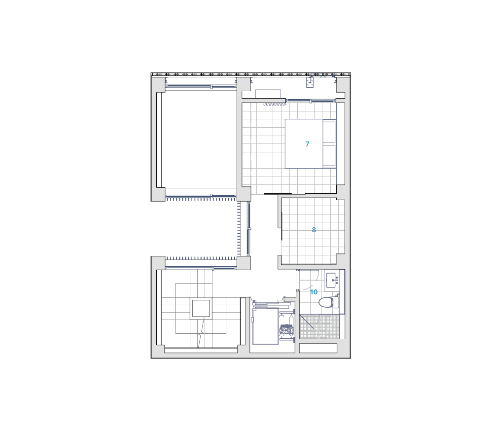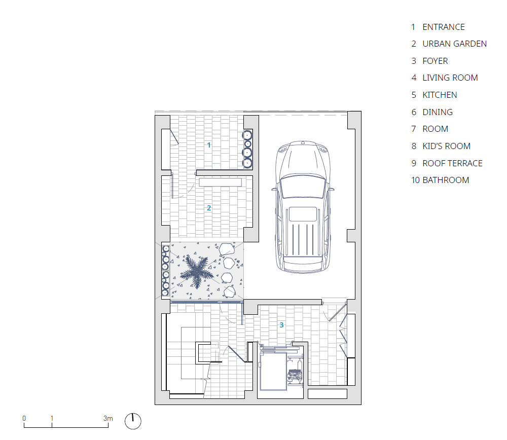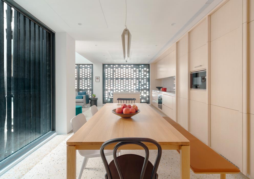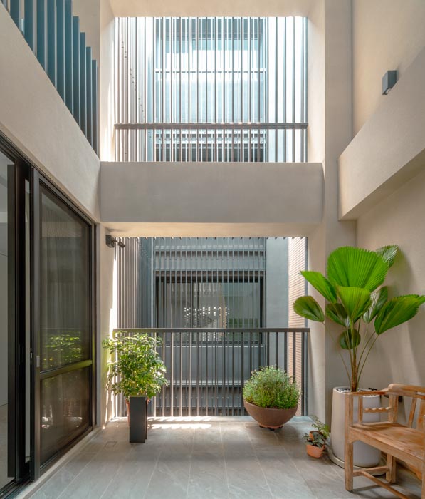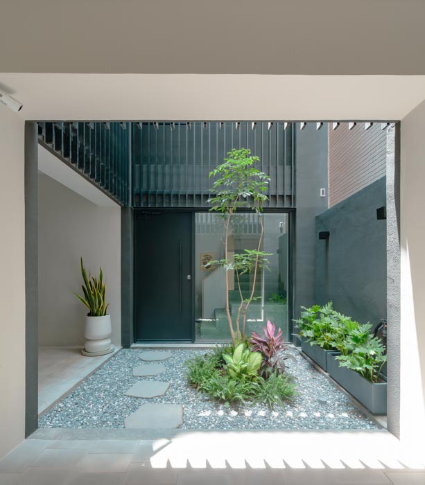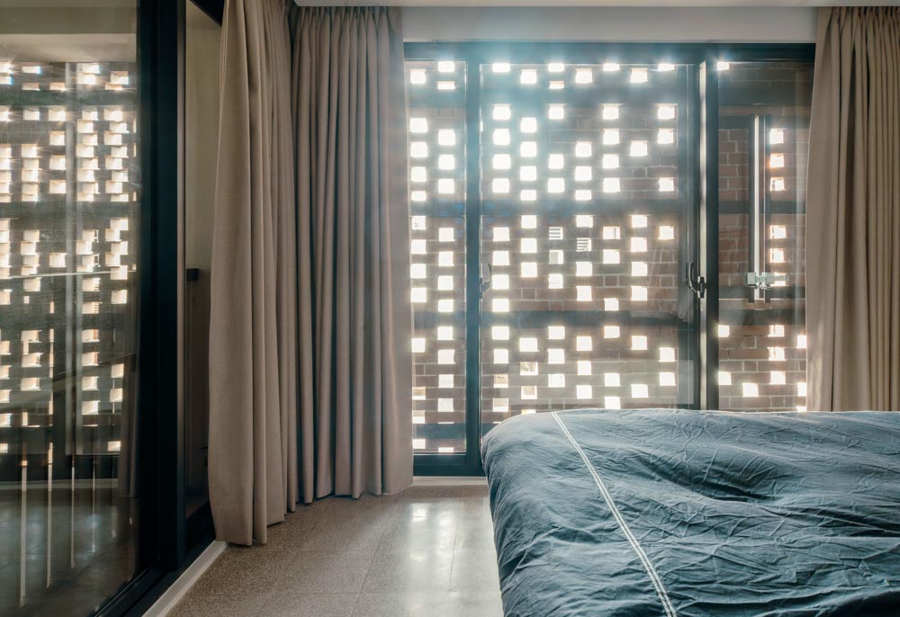 When you enter the building from a bustling city street, a relaxing urban garden awaits you. The courtyard that greets you next is like the engine of the building. The aluminum louvers of the courtyard bring light to the garden and bedroom balconies on the ground floor, and create cross-ventilation with the exterior finishing brick material. The interior finishes are unified with terrazzo flooring and oak woodwork to accentuate the brick exterior. The elevation of the Veil House not only defines the exterior of the building, but also creates a cozy interior space that feels like a break from the busy city center.