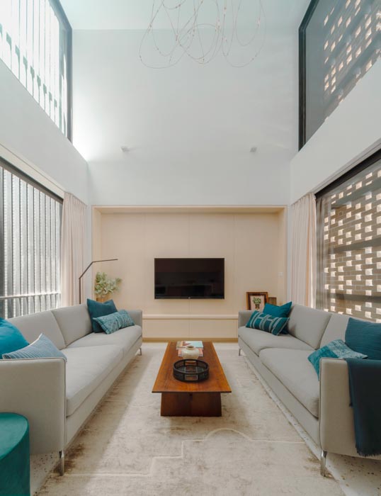 The site is located on a narrow street, with houses rubbing shoulders with each other, so privacy was an issue to be solved. While the neighboring houses have blinds on their windows and do not use exterior spaces such as balconies or terraces, the brick exterior of the Veil House shields the external space, ensuring privacy. Additionally, the openings allow sunlight into the living space and provide ventilation.