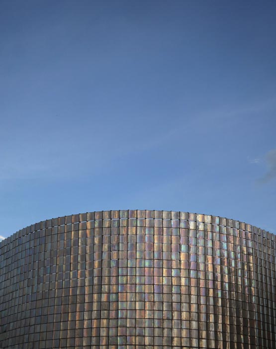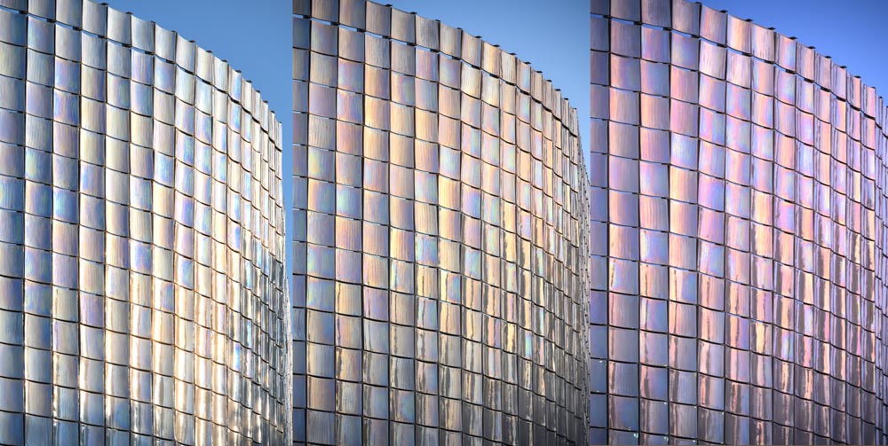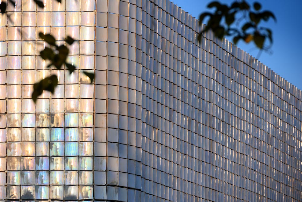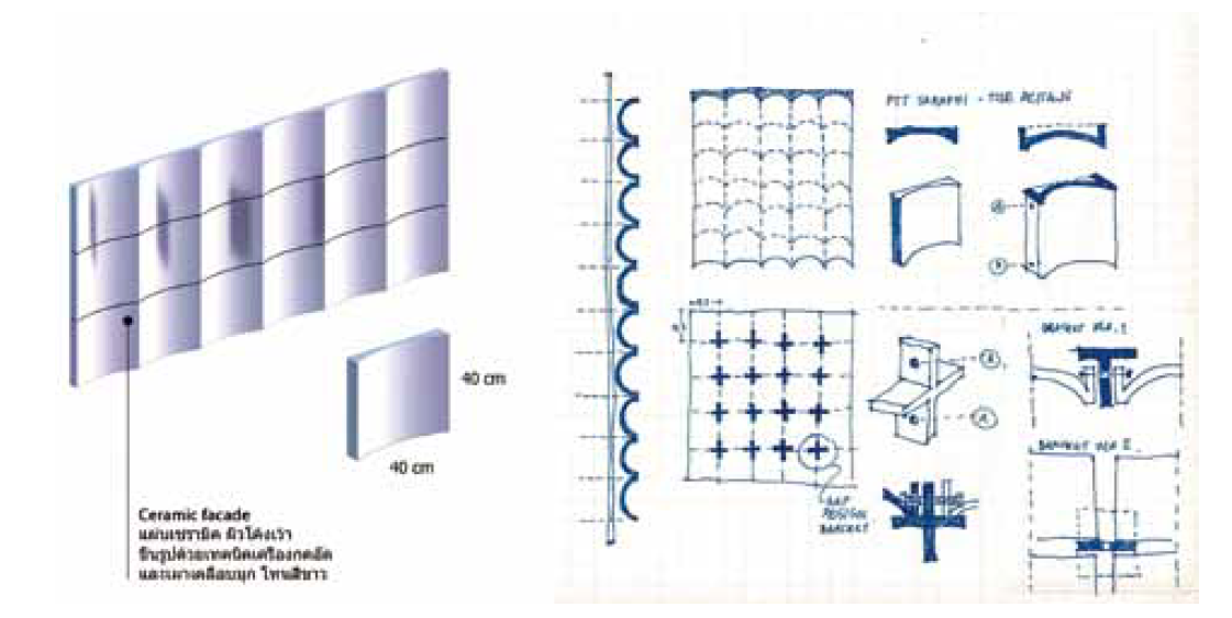 기와의 곡면은 하늘의 색을 반사하고, 이에 따라 건물의 외벽은 하루의 시간 변화에 따라서 시시각각 변화한다. 반사를 표현하기 위해 진주광택 유약을 입혔는데, 공예품의 매력은 여기에서도 드러난다. 수작업으로 완성된 타일은 각자 다른 색깔을 지니고 있어 외벽에 리듬감을 부여한다. 셔 메이커는 외벽 디자인을 구현하기 위해 치앙마이 공방 세 곳과 협업했다. 채체이왓 스튜디오는 목업과 초벌 작업을 맡았고 기와 전문가인 메림 세라믹은 디자인 컨설팅을 진행했다. 진주광택 코팅 등의 최종 공정은 주유소와 같은 지역에 있는 사라피 세라믹 아츠앤디자인에서 담당했다. 진주광택 기법은 이곳의 전문 분야이므로 외장재 생산 시스템을 갖출 수 있었다. 피티티 사라피 주유소는 지방 도시의 인력과 기술을 적용하여 지역 상생과 발전에 이바지한 유의미한 프로젝트이다.