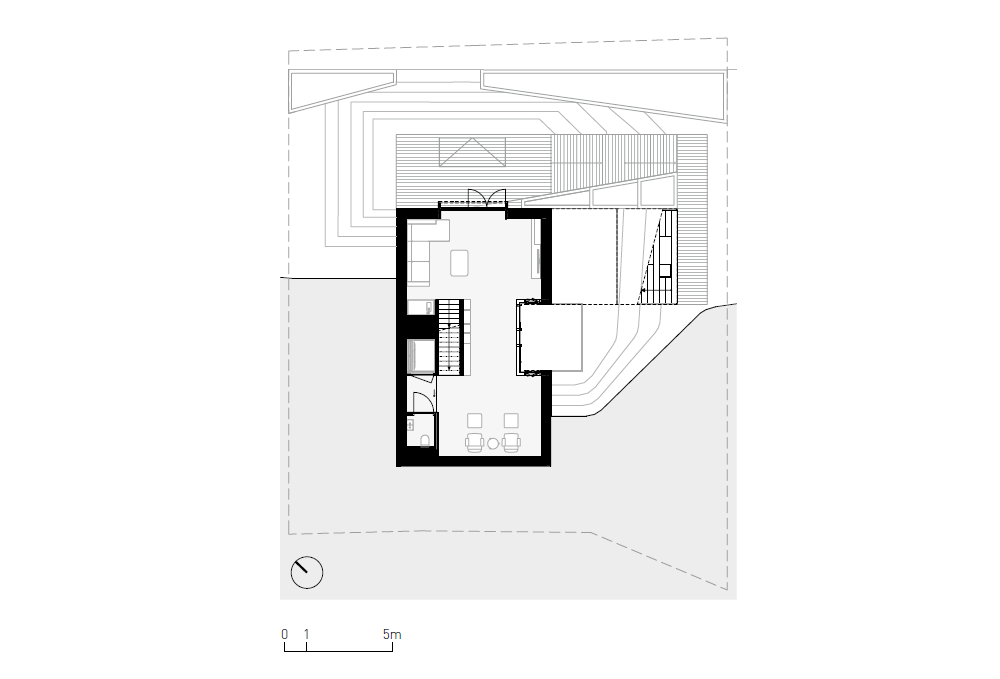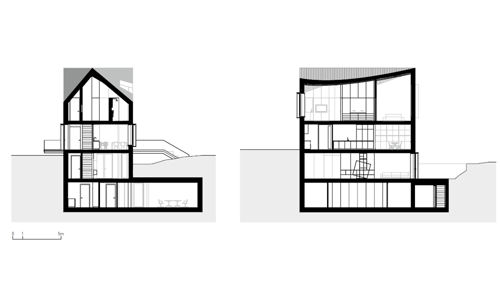 Villa BW is a villa built to suit the land environment where dunes meet reclaimed land. With its twisted, curved roof and colorful tile finish, it looks unique at a glance, but blends in naturally with its surroundings. The atypical curved roof was inspired by the roof shapes of the surrounding buildings on the site. The houses on the dunes have gabled roofs, while those closer to the reclaimed land have flat roofs. The overlapping of these two roof shapes creates a unique roof design and gives a natural accent to the monolithic massing. The attic is hidden beneath the roof of the four-story villa, while the ground floor and basement floor have direct access to the outside space, taking advantage of the sloping terrain of the dunes and reclaimed land. A curtain wall was applied to the basement level to create an open space with natural light. The core extending from the basement level uses wood finishes to provide privacy for spaces that require it, such as restrooms.