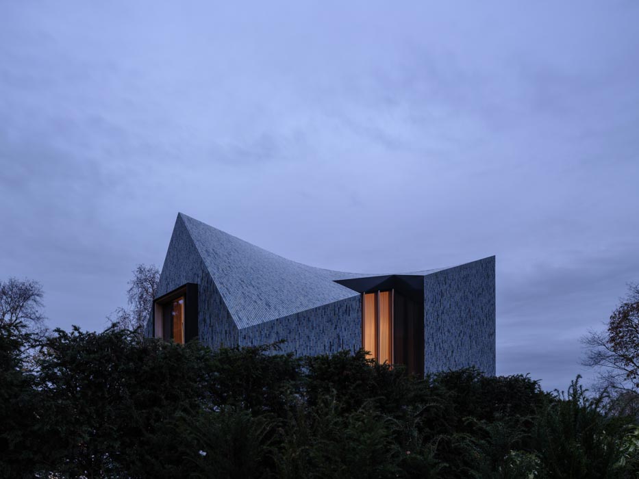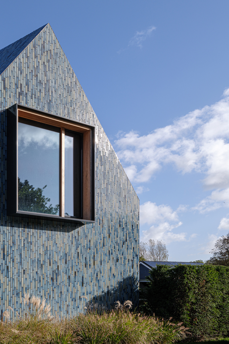 외장재와 지붕재는 한 가지 재료로 통일하여 일관성을 부여하고, 인공적인 재료가 아닌 맞춤 제작한 세라믹 타일을 사용하여 자연과의 연결성을 강조했다. 파사드의 메인 요소인 유광 타일은 사구와 간척지의 사계절 풍경에서 따온 색상 팔레트를 적용했다. 다섯 가지 음영의 초록, 파랑, 회색으로 이루어진 타일은 건축물을 주변 풍경에 자연스레 녹아들게 한다. 색상과 코팅은 대지에서 진행한 샘플 스터디를 통해 선정했는데, 빛의 변화에 따라 시시각각 다채롭게 변화하는 외관을 표현하기 위해 유광 타일로 결정했다. 수직 패턴과 오픈 조인트는 지붕까지 일직선으로 이어지는 타일 디자인을 가능케 했다. 지붕의 곡선은 반복되는 패턴이 눈에 띄지 않도록 변화를 주어 파사드가 한층 자연스러워졌다.
