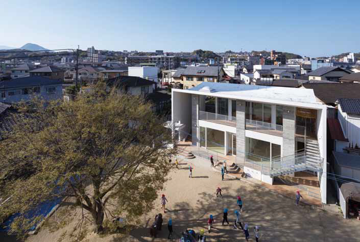 오이타 이치고 유치원 분원은 주택가에 자리한 기존 유치원의 놀이터 같은 공간으로 계획됐다. 동서쪽으로 펼쳐진 광장은