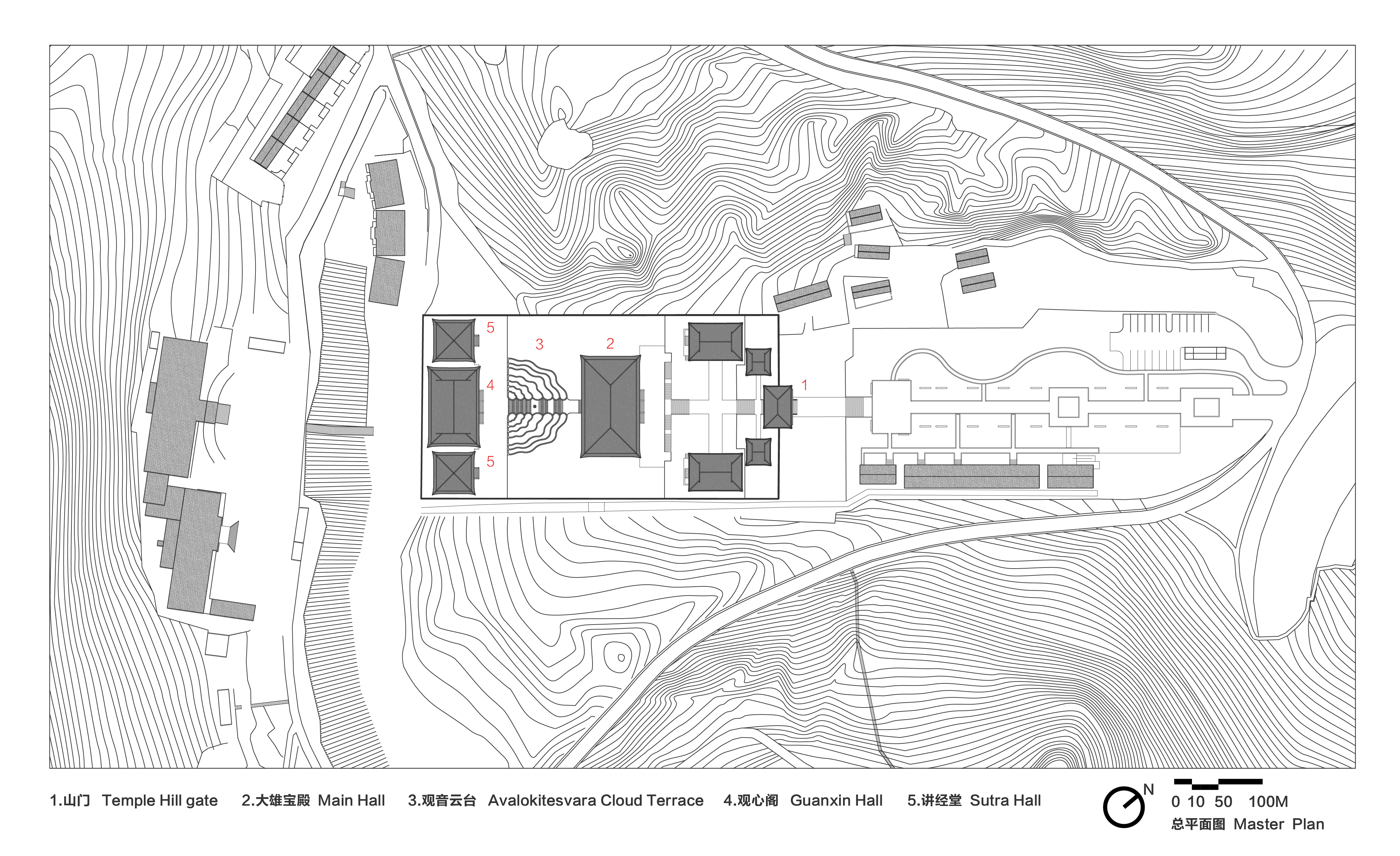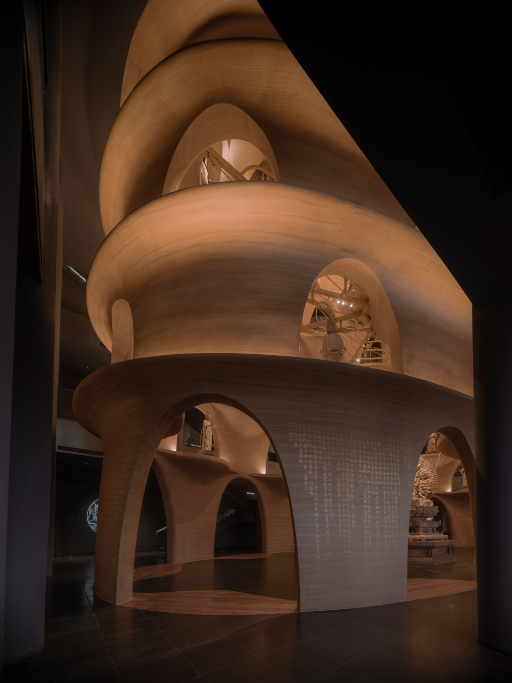 The Zushan Ji Xin Temple's Wooden Buddha Museum was created by combining various arts, including interior design, exhibitions, visual design, sculpture, landscaping, and lighting. The entrance to the museum behind the main hall is a Cloud Terrace resembling the terrain, serving as a means to approach the spiritual experience and smoothly overcome a 10m level difference. The main hall's Buddha exhibition was designed with a “Pagoda” motif. The seven layers of the pagoda, narrowing as they rise, allow a vertical display of Buddha statues of various sizes in a limited space.