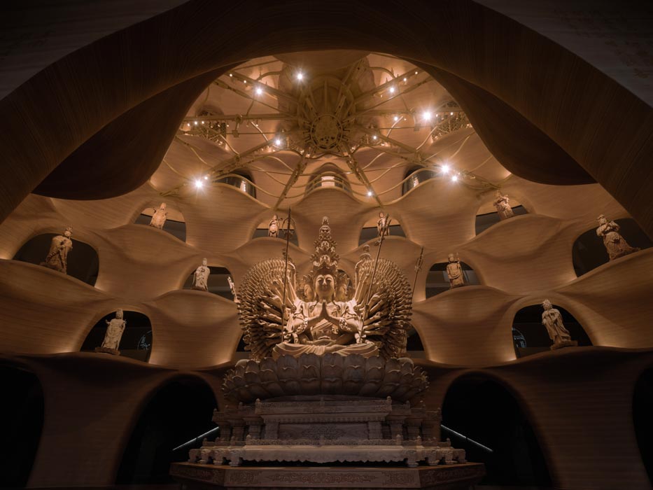 주산 지신사의 목불 박물관은 인테리어, 전시 및 시각 디자인, 조각, 조경, 조명 등 다양한 예술을 조합하여 만들어진