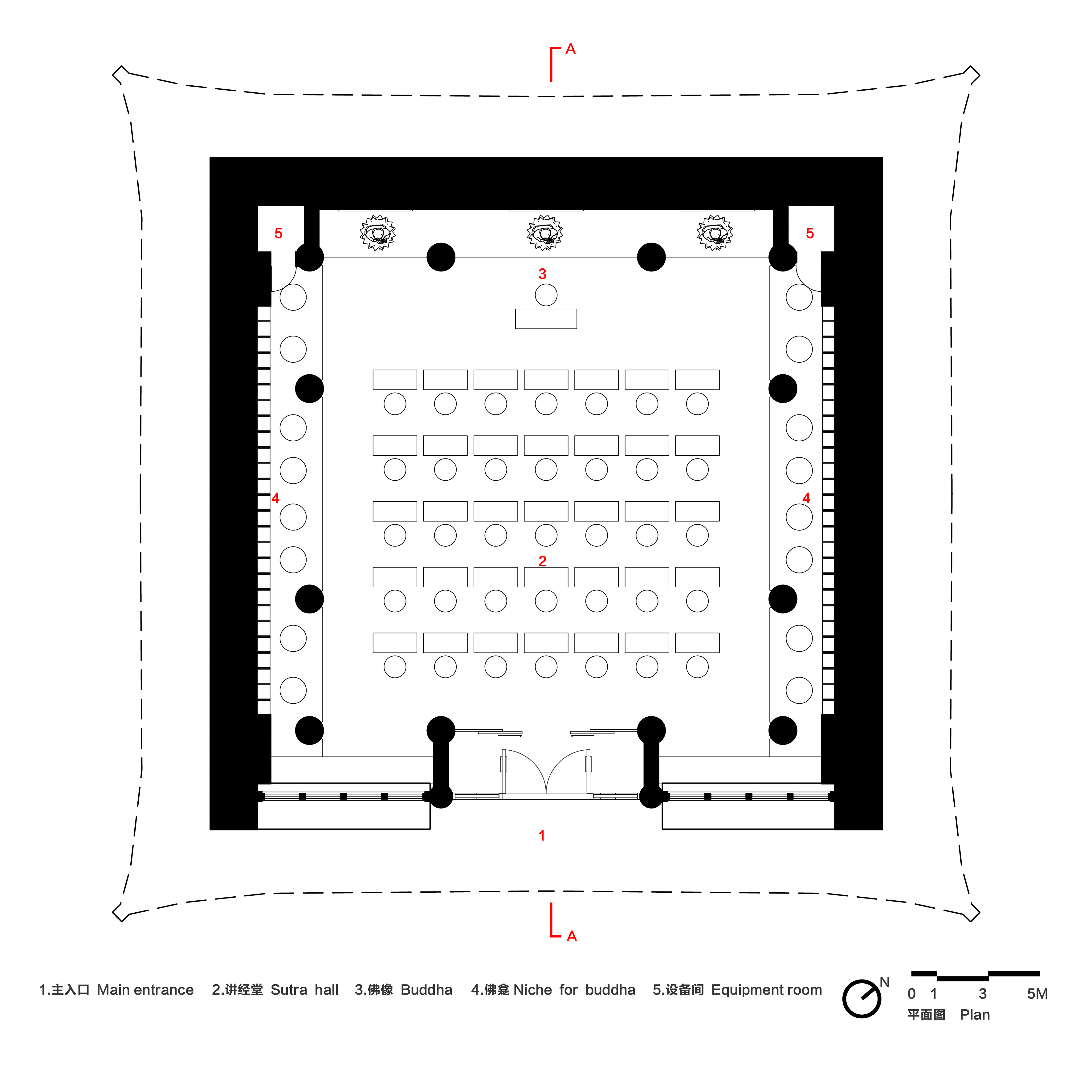 의식과도 중첩된다. 인테리어 조명은 각 불상에 맞추어 계획했고 외부 창호에는 반투명한 필름을 부착하여 내부 조명의