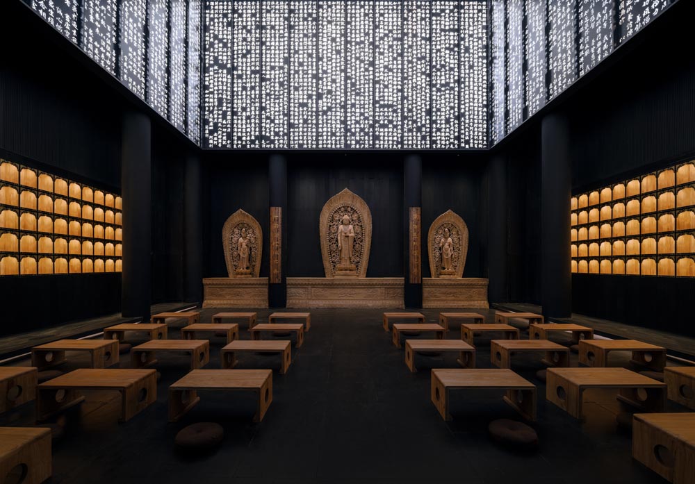The interior draws inspiration from the mandala shape symbolizing the universe in Buddhism. The platform planned for circumambulation around the tower overlaps with Buddhist consciousness of circling. Interior lighting was planned to highlight each Buddha statue, and transparent film has been applied to external windows to maximize the effect of internal lighting. The education room, used as an annex, features scriptures engraved on metal plates attached to the walls extending up to the 11m ceiling, and a futuristic lighting design causes the scriptures shine in the darkness. Through the renovation, the Wooden Buddha Museum, Jusan Jishin Temple has evolved into a place for meditation, going beyond the traditional temple setting to appreciate art and explore philosophy and wisdom.