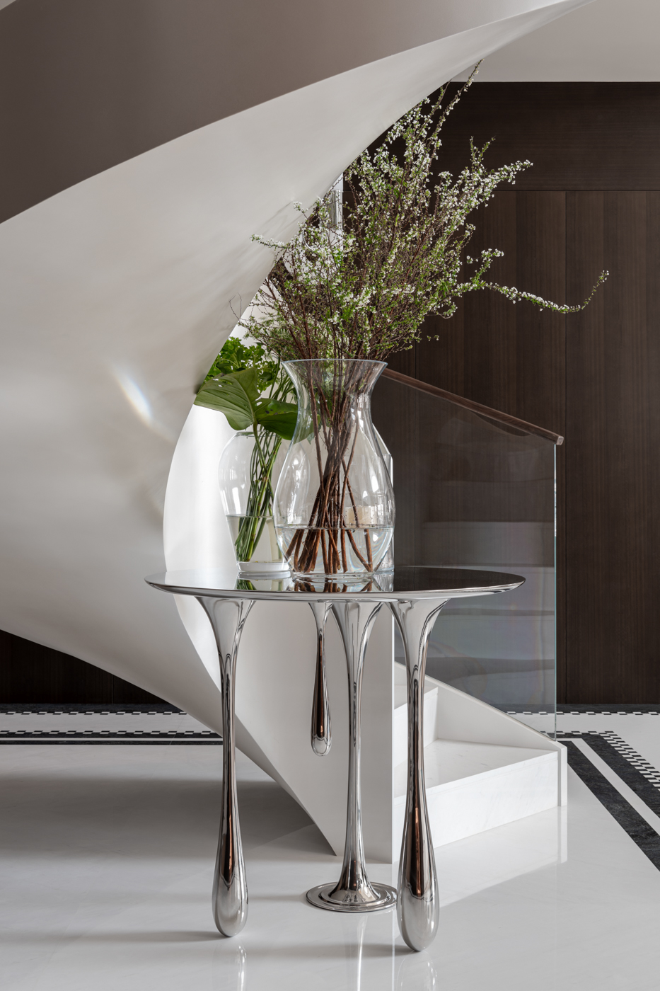 EVD (Everyday Design) defines a home not just as a simple living space but as a place that encapsulates the emotions of daily life. Located in Qingxi Garden on the western outskirts of Shanghai, this villa is designed for a young family, reflecting the diverse styles of a younger generation with a clear sense of self-expression. Artistic elements such as sculptures, lighting, and paintings seamlessly blend in the space, but careful planning ensures that there are many walls resembling blank canvases to achieve harmony. Natural light pouring in from the ceiling is also utilized as a design element showcasing the strength of the architecture. At noon, a half-moon-shaped skylight in the form of an arch above the living room ceiling allows a special experience of standing inside a dome as natural light bathes the space. The spiral staircase at the center of the house gently completes what could otherwise be a monotonous space. Areas such as a gallery-like loft, a playroom for children, and a leisure area included in the master bedroom blend various finishes and artworks, creating a balance between life and art.
