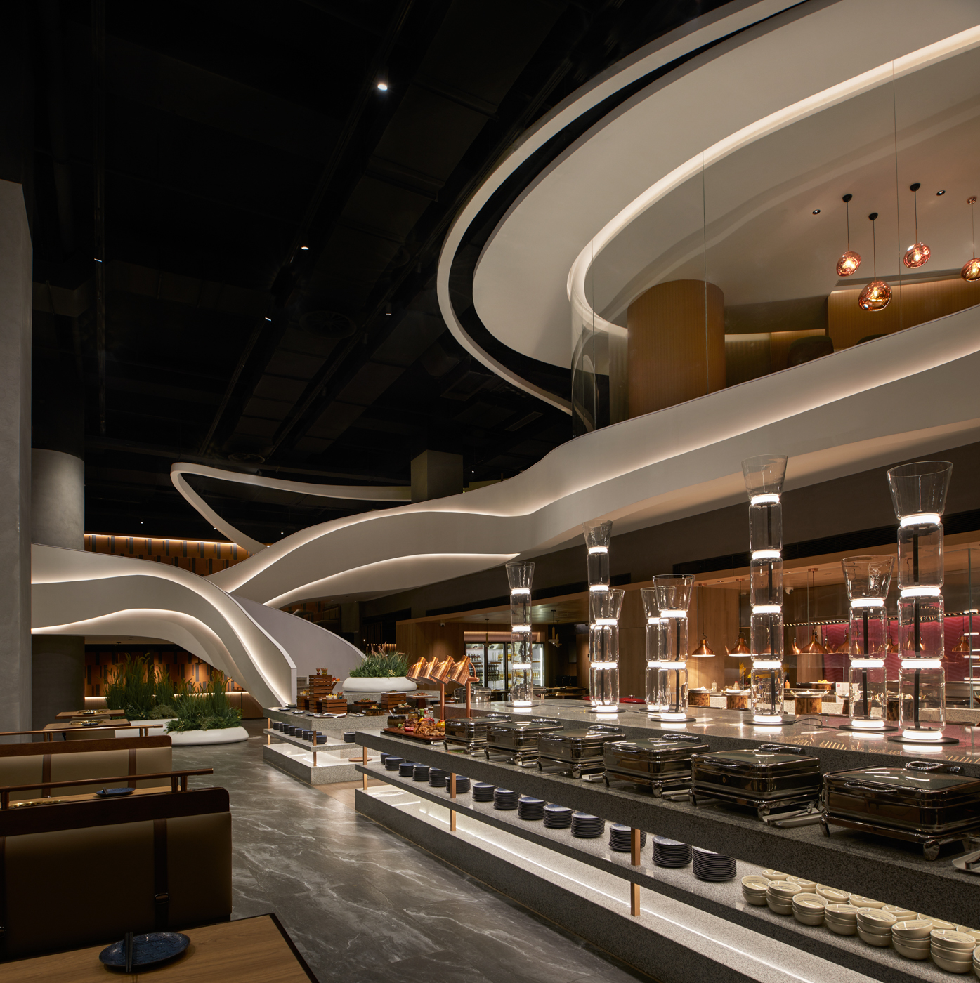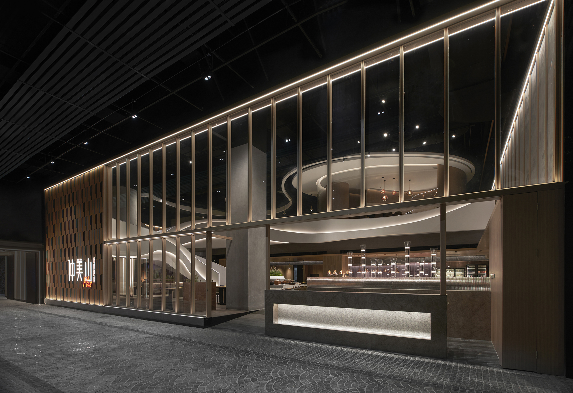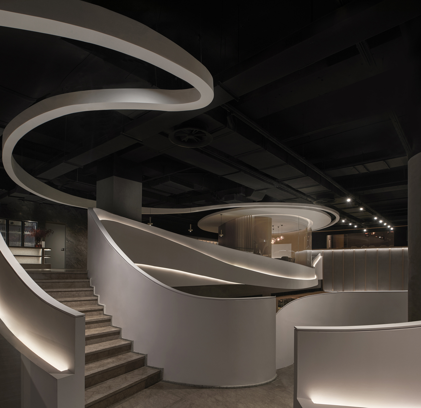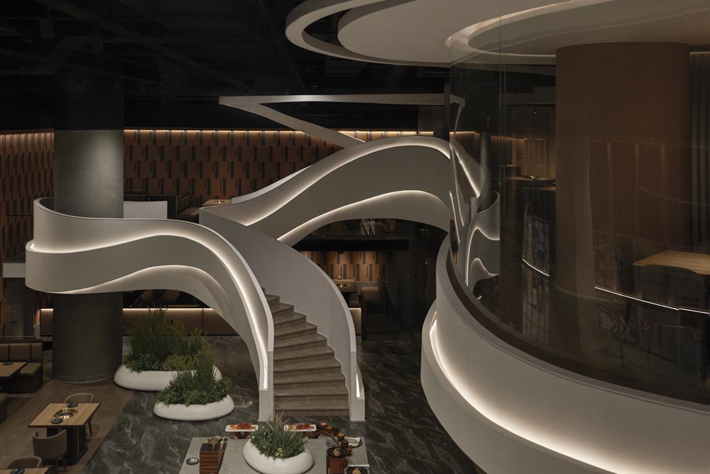 Zhongmeishan has opened a brand store in the Olympic North area of Beijing to meet the needs of an upscale clientele. The architect departed from the monotonous square construction of the existing commercial space, integrating meticulous design elements and readability through the convergence of light and shadow. The soaring white staircase serves as the visual focal point of the store, creating a linear structure of freely flowing curves reminiscent of continuous mountain ranges. The sculptural form and embedded backlight of the staircase elevate the aesthetic aspects of the entire space and provide a bright circulation path in the dark area. The dining tables on the first floor, arranged in an intersecting manner in the open space, are designed to utilize light and shadow. Overall, a harmonious balance is achieved between strength and softness, the contrast of light and shade, and the interplay of rectangles and flowing lines. The first floor is designed to provide interactive spaces, while the second floor creates an atmosphere for private and intimate conversations. The store stimulates a multisensory enjoyment where customers can enrich their dining experience, savor delicious food, and appreciate architectural beauty in a tactile and enjoyable manner.