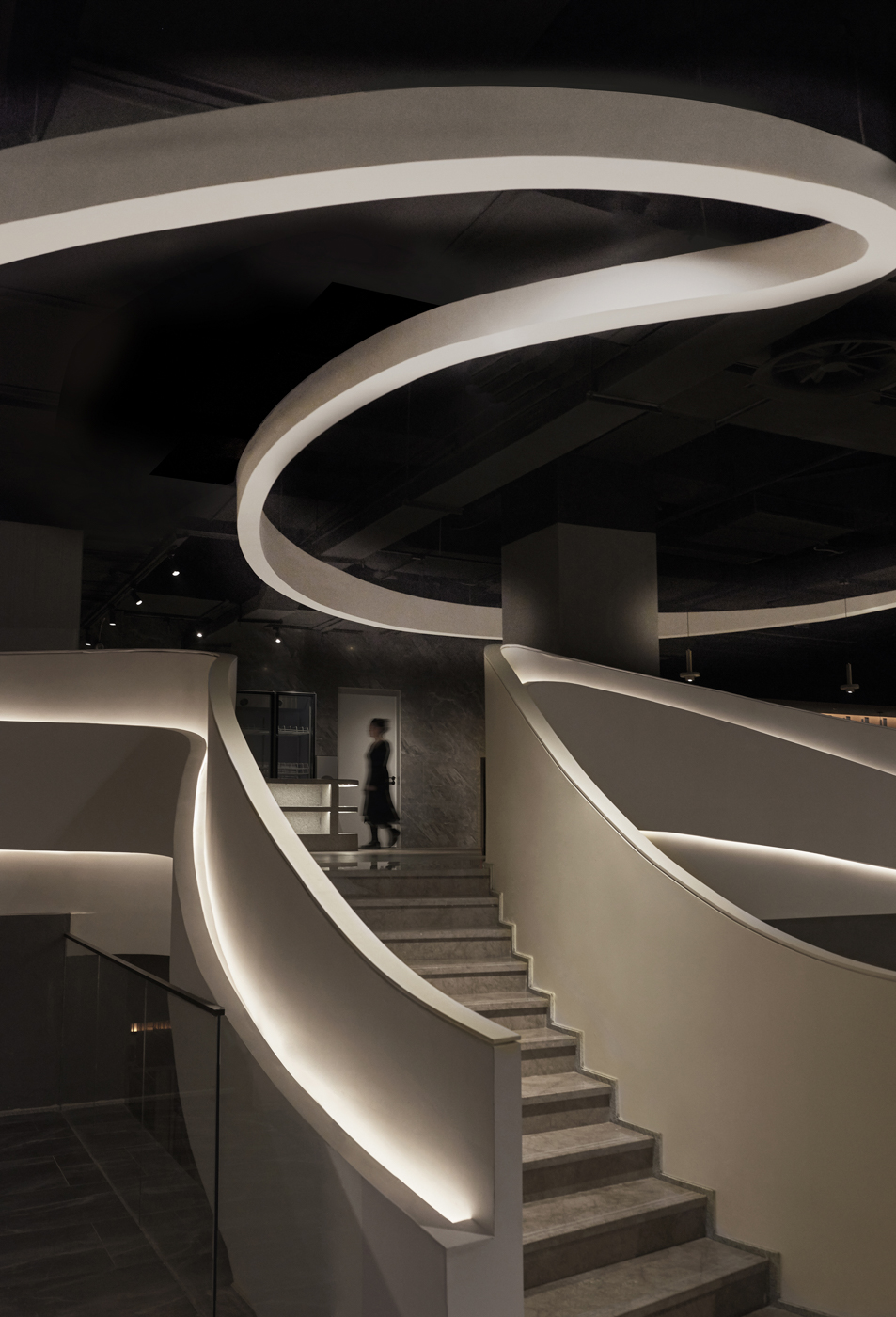 산맥의 형상으로 자유롭게 흐르는 곡선의 선형 구조를 만들어 낸다. 계단의 조각적인 형태와 내장된 백라이트는