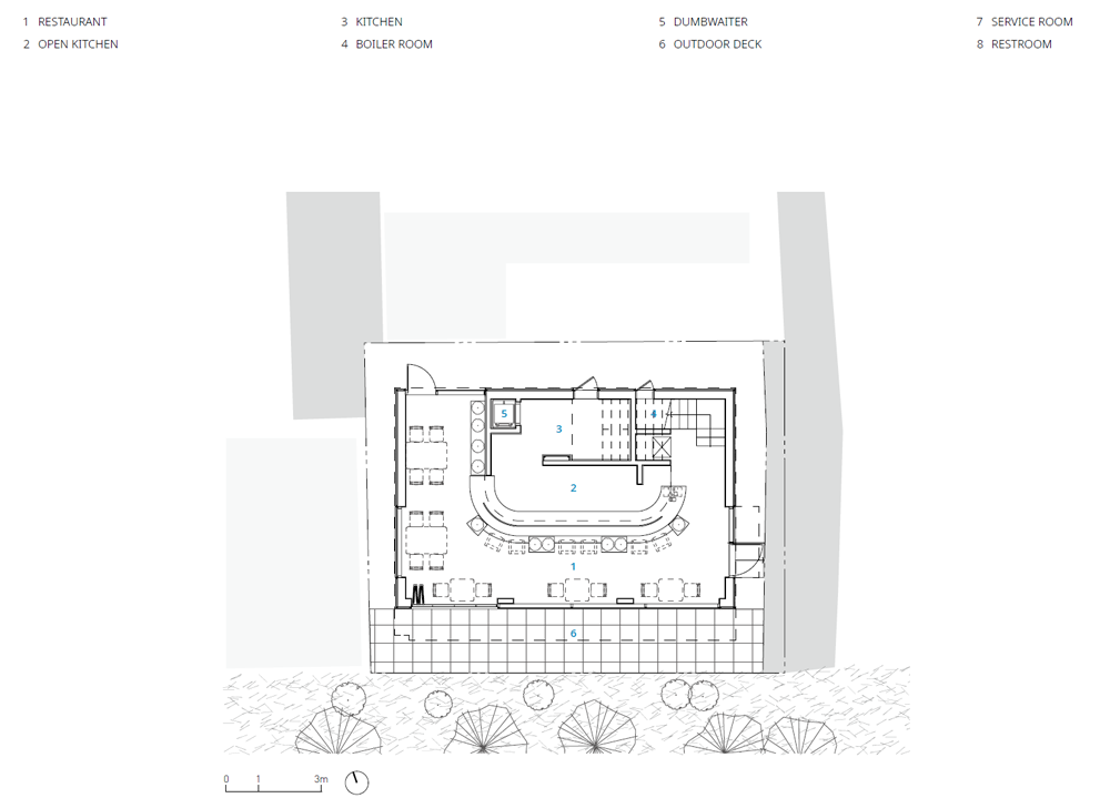 Gyerim Nu (樓) is a small restaurant located on the Pureungil promenade that traverses the downtown area of Gwangju. The Pureungil promenade is a small linear park deeply embedded in the lives of Gwangju citizens. Despite its small scale, the building captures the attention of passersby, and the owners hope that their curiosity will lead to a visit. At the same time, it was crucial to harmoniously coexist with the Pureungil landscape without compromising its beauty.