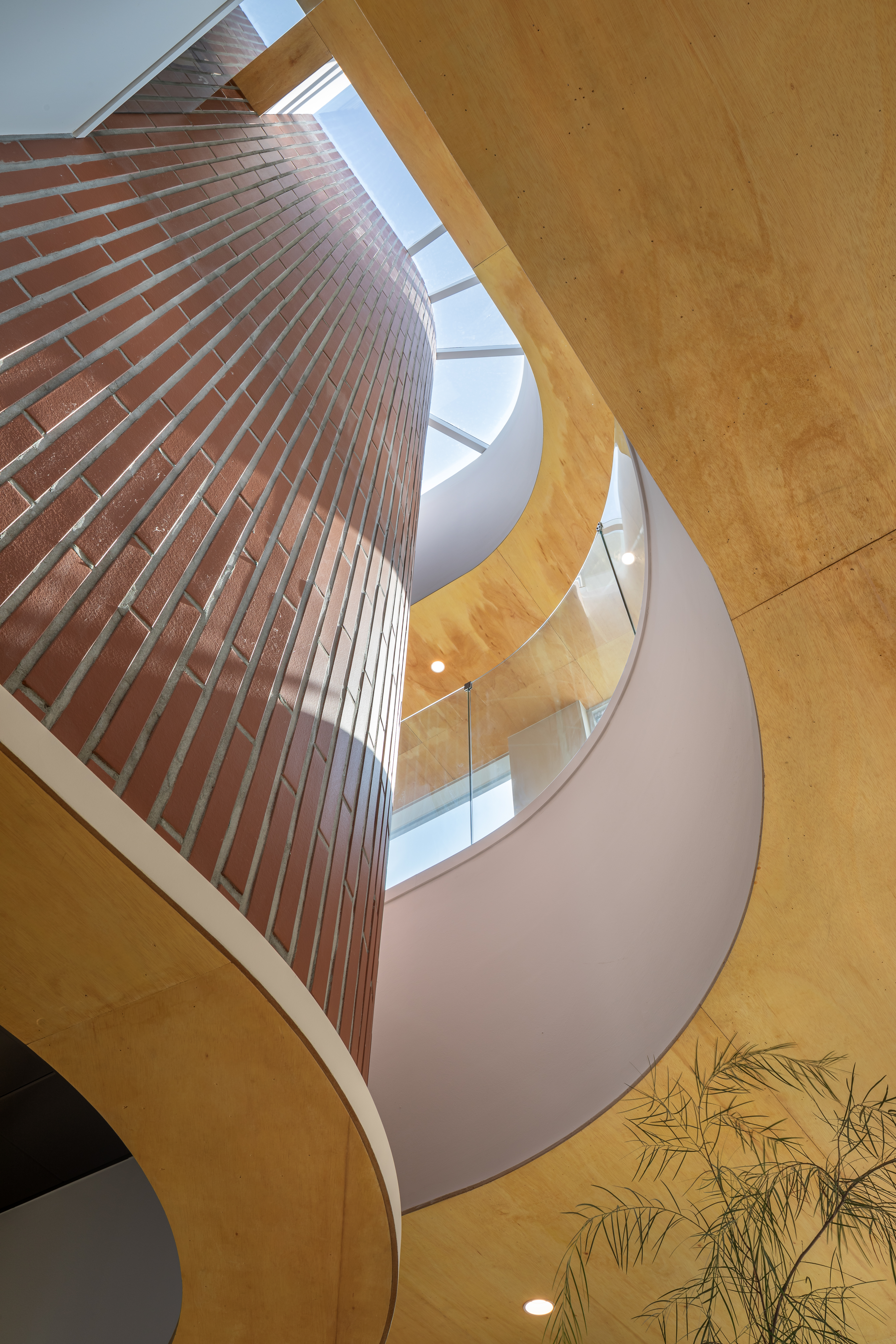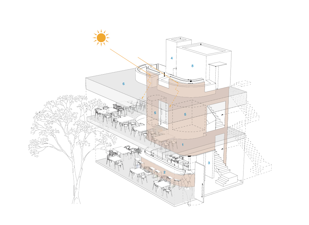 대지는 지구단위계획구역에 속해 있어, 1층 가로 경관 후퇴가 필수였다. 또한 주차 공간을 만들 수 없어 연면적에 한계가 있었다. 법률적인 한계를 극복하기 위해 원통형의 유틸리티 공간과 영업장 사이에 빈 공간을 계획하여 최대한 공간을 활용했다. 또한 천장을 통해 1층까지 들어오는 빛은 실린더의 볼륨을 더욱 강조한다.