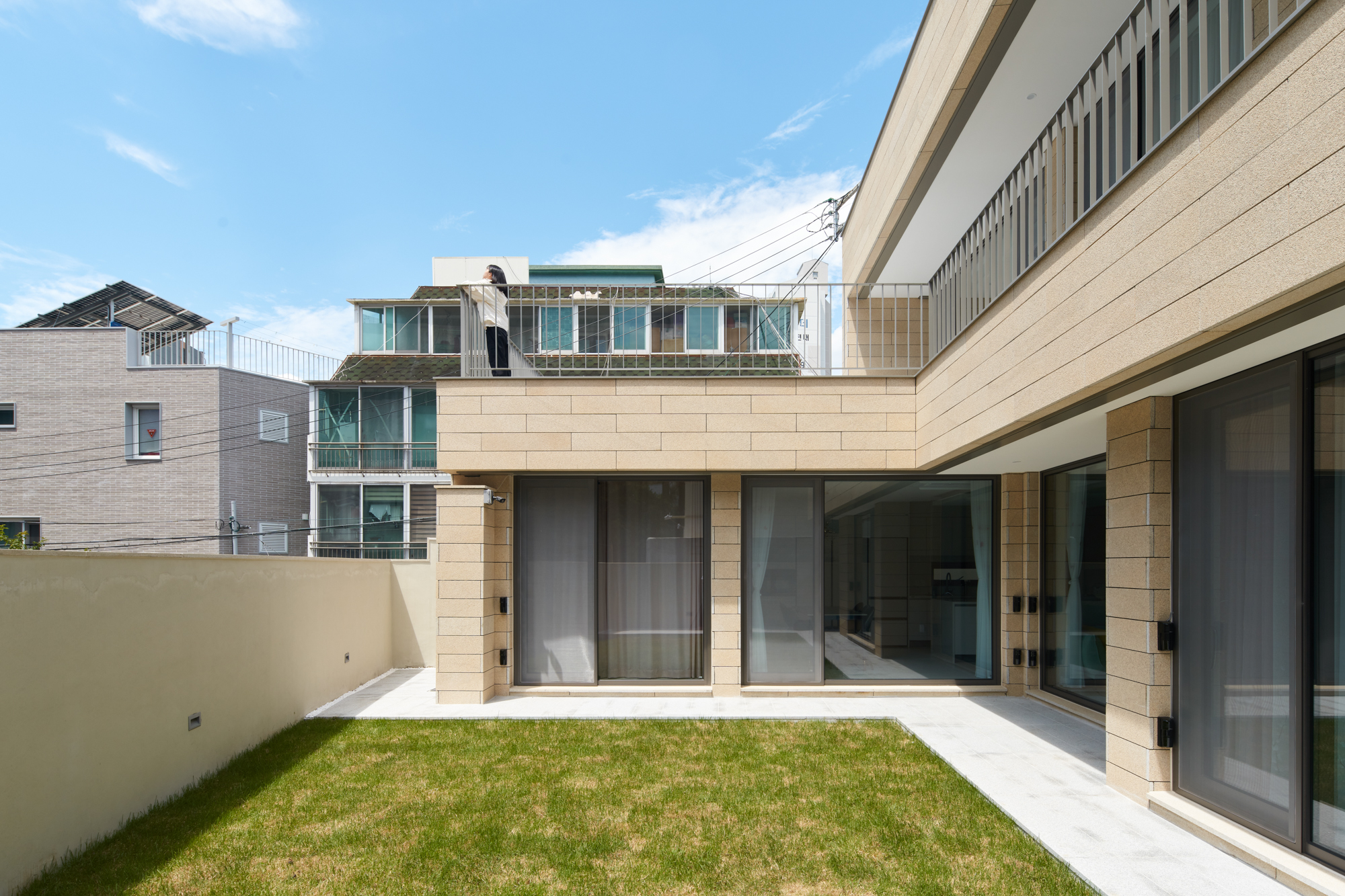 To create a bright living space, a courtyard was placed to the south, while parking spaces were located to the north for accessibility. The first floor, which serves as the central living space for the couple, is organized around the courtyard, with the master bedroom, living room, and kitchen, along with a guest room positioned on one side to provide privacy to the master bedroom. The second floor is designed as an independent living space for the children, with a small kitchen, living room, and bedroom. The living room, which offers the only open view, is envisioned as a spot for private relaxation. Both sides of the living room feature spacious terraces, allowing for various outdoor activities.