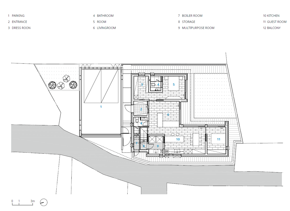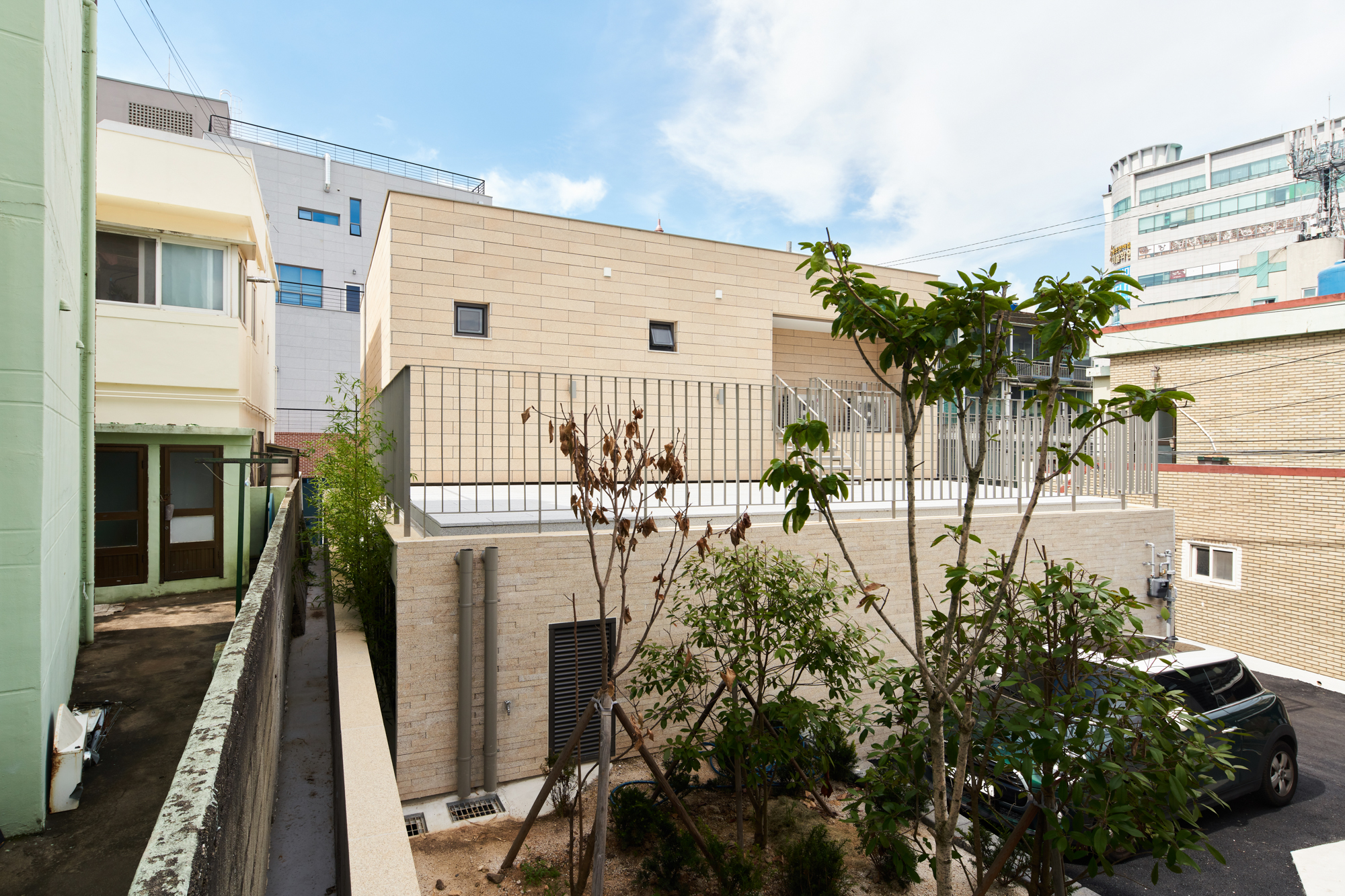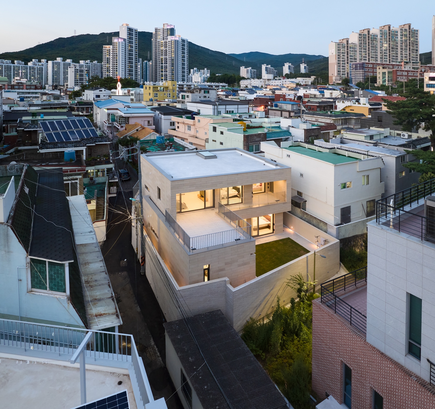 Heeijae is a house built by a couple who lived with their kids who are in their 20s, and were thinking about the future visits of their grandchildren when they come to play. It is located in a housing complex in Hwamyung-dong, a newly developed city, which has been forming for the past 40 years. The land is bordered by a sloping road to the west, with the rest abutting a church and houses. The relationship with adjacent buildings with varying floors and levels, and the connection to the entrance road on the sloping street, were crucial considerations.