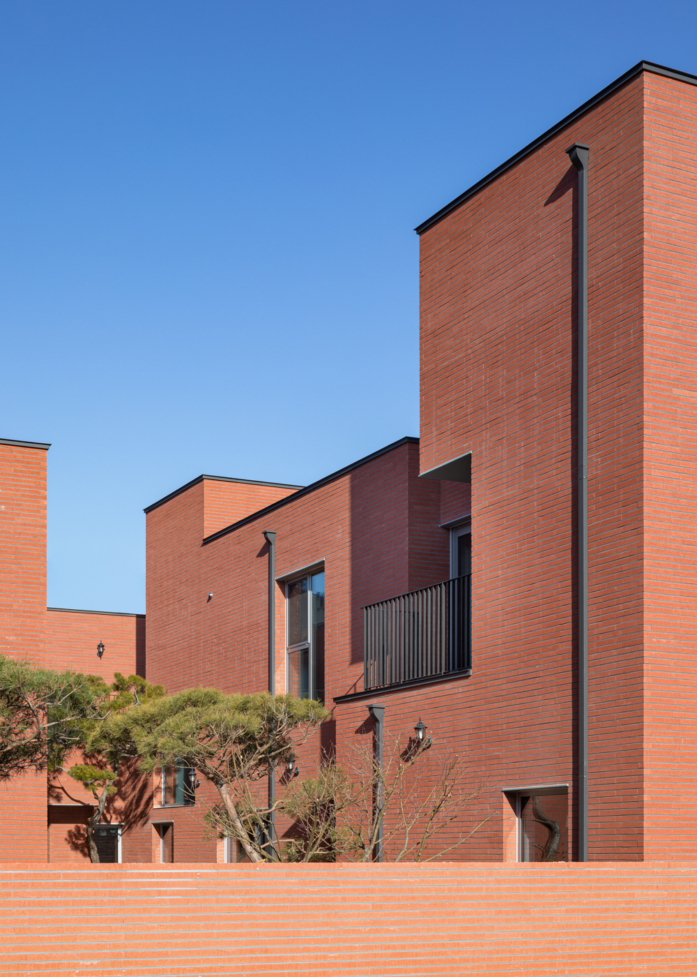 외장재로 선택한 붉은 벽돌은 집의 분위기와 어울리고 시간에 따라 변화하는 재료이다. 외벽의 곡선 부분은 벽돌의 거친 면으로 마감하고, 내부는 일반 벽돌에 가로줄눈으로 시공하여 내외부 각각에 차이를 주었다. 밖에서 바라볼 때는 하나의 재료, 벽돌만 보이도록 디테일을 고민했다. 그 결과 플래싱과 외부 천장의 금속 디테일은 선적인 요소로 보이도록 계획했다.