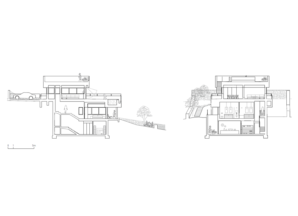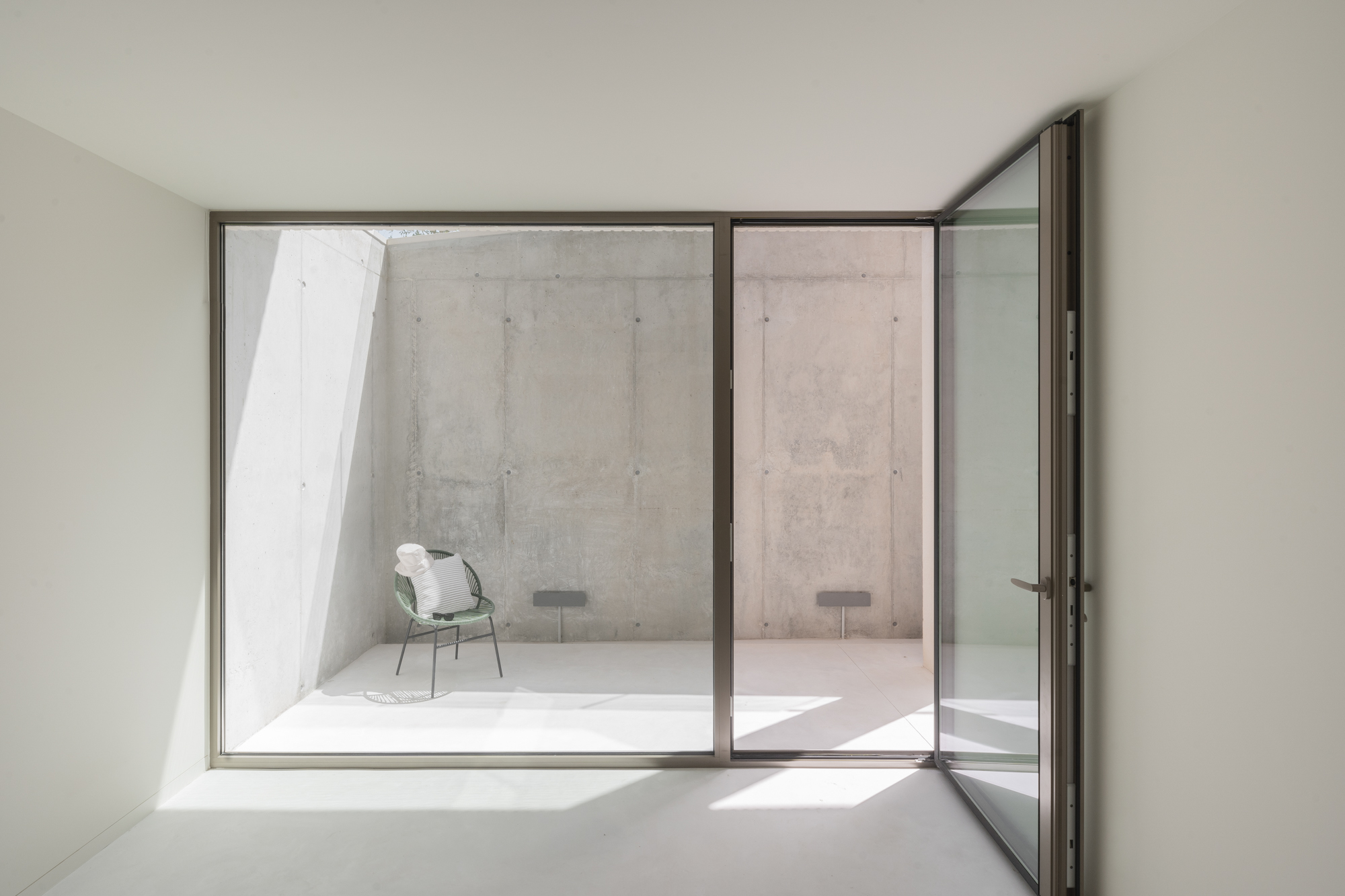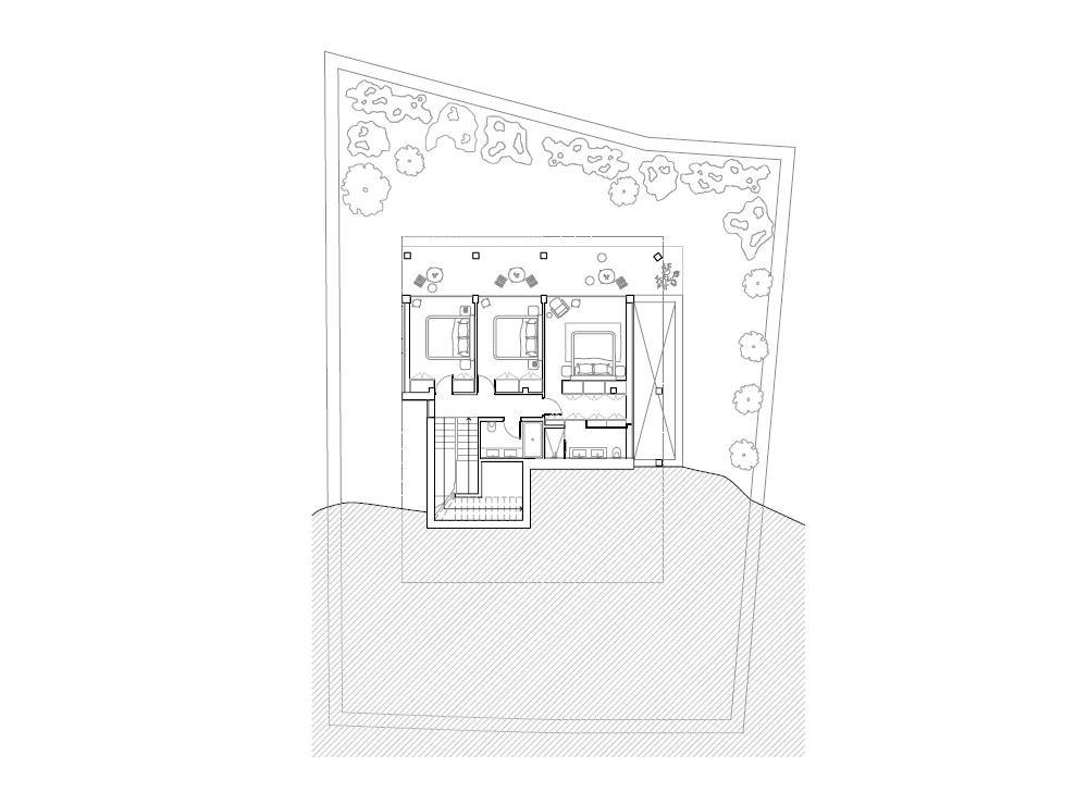 Windows are applied on all sides, allowing the enjoyment of the scenery from any part of the villa. The terrace and outdoor swimming pool are positioned on the top floor for an optimal view of the sea, and to ensure ample sunlight and ventilation on all three levels, an expansive patio was planned for the basement.