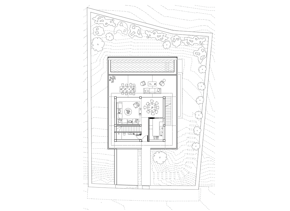 Named “Shift,” the design evokes a dynamic aesthetic within the confines of a limited site. Disrupting the simplicity of a rectangular volume, substantial concrete masses are strategically placed to form a horizontally banded structure that integrates with the surrounding environment, resembling lines drawn by windows. Glass windows, planned like gaps in vertically carved concrete walls, provide an intriguing contrast.
