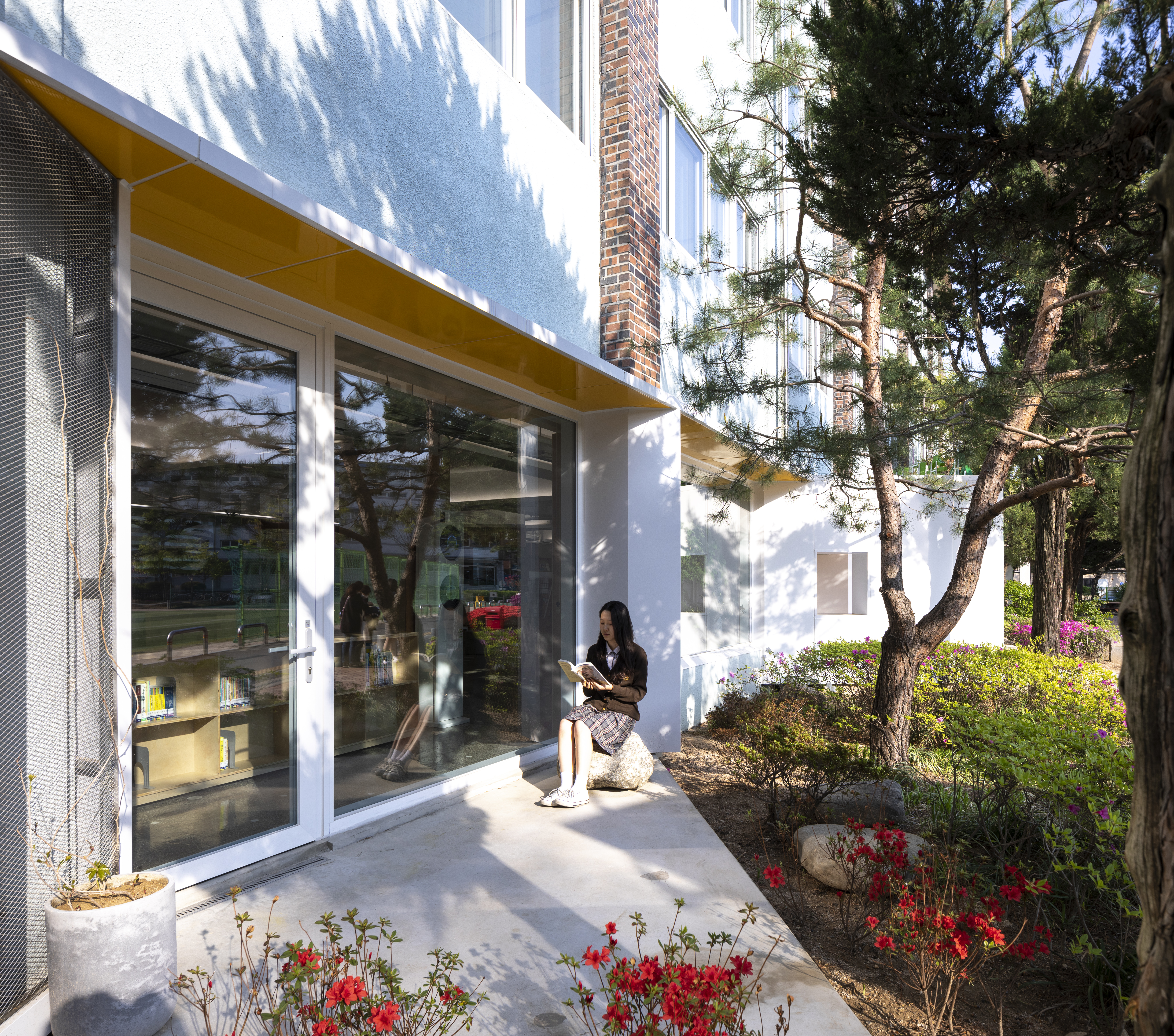 리모델링한 도서관은 단순히 책을 보는 공간이 아니라 학생들의 다양한 요구와 활동을 품는 공간이 됐다. 학생들이 쉬는 시간 동안 지친 마음을 편하게 명상하고, 방과 후 자신만의 자리를 만들 수 있는 사랑방 역할의 공간이 되길 바랐다. 이를 통해 도시 속 공원 생태계를 의미하는 도서관의 테마를 이끌어 내며 ‘숲도서관’이라는 이름의 공간이 됐다. 내외부를 단절시키던 불필요한 외벽을 허물고 전면창, 야외 테라스를 설치하였다. 새롭게 조성된 실내 조경은 자연을 통해 도서관의 외피의 경계를 형성하며, 운동장을 향해 개방되어 책과 자연이 어우러진 공간이 됐다. 다양한 형태의 좌석 배치는 기존의 경직된 질서를 깨고 자유롭게 흩뿌려진 공간 사이에서 자신만의 자리를 찾아 갈 수 있게 한다. 새롭게 단장된 도서관은 더 이상 벽 뒤에 숨겨진 공간이 아니다. 학생들이 책을 읽고 담소를 나눌 수 있는 대표 공간으로 거듭나 학생들에게 즐거운 장소를 경험하는 기회가 됐다.