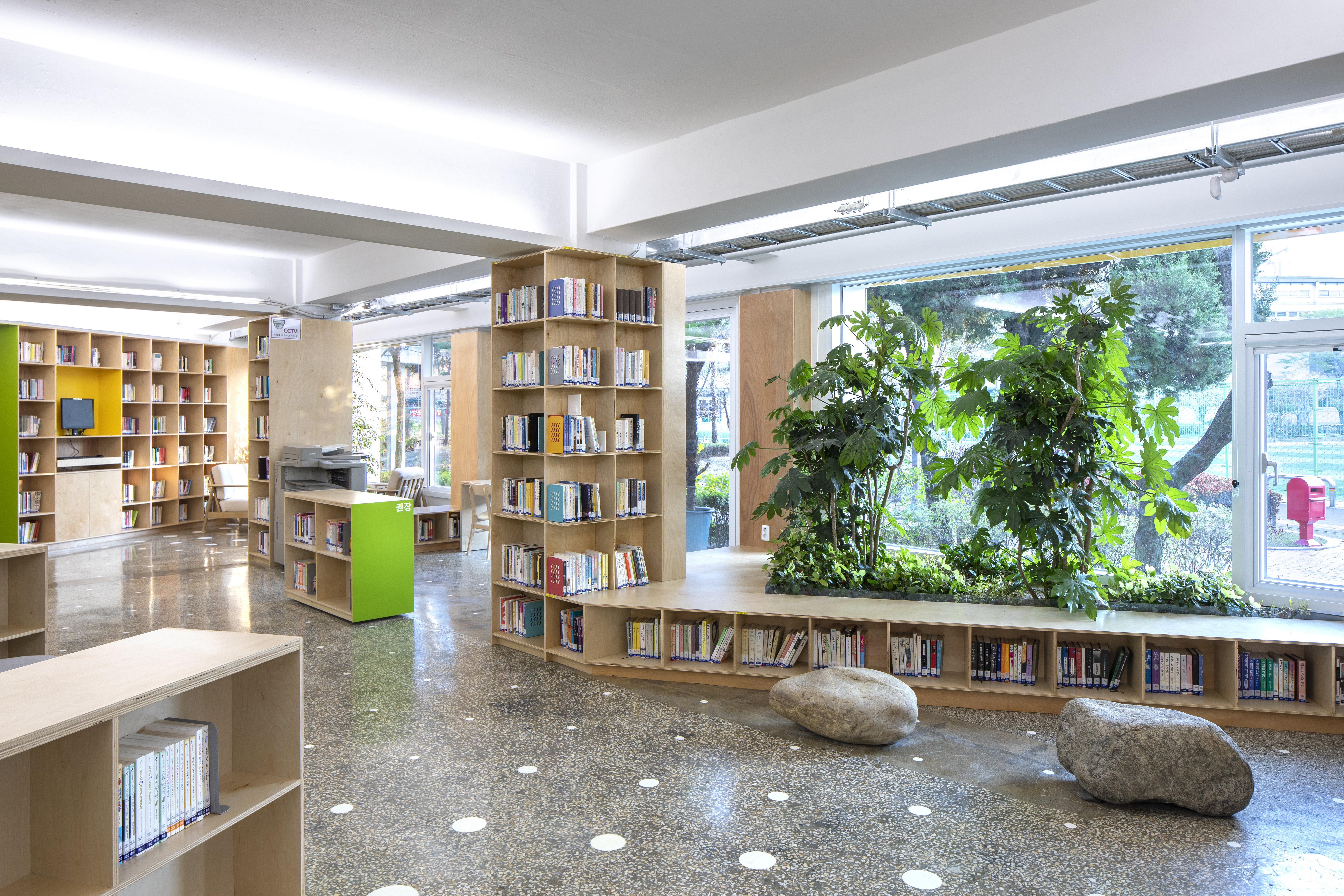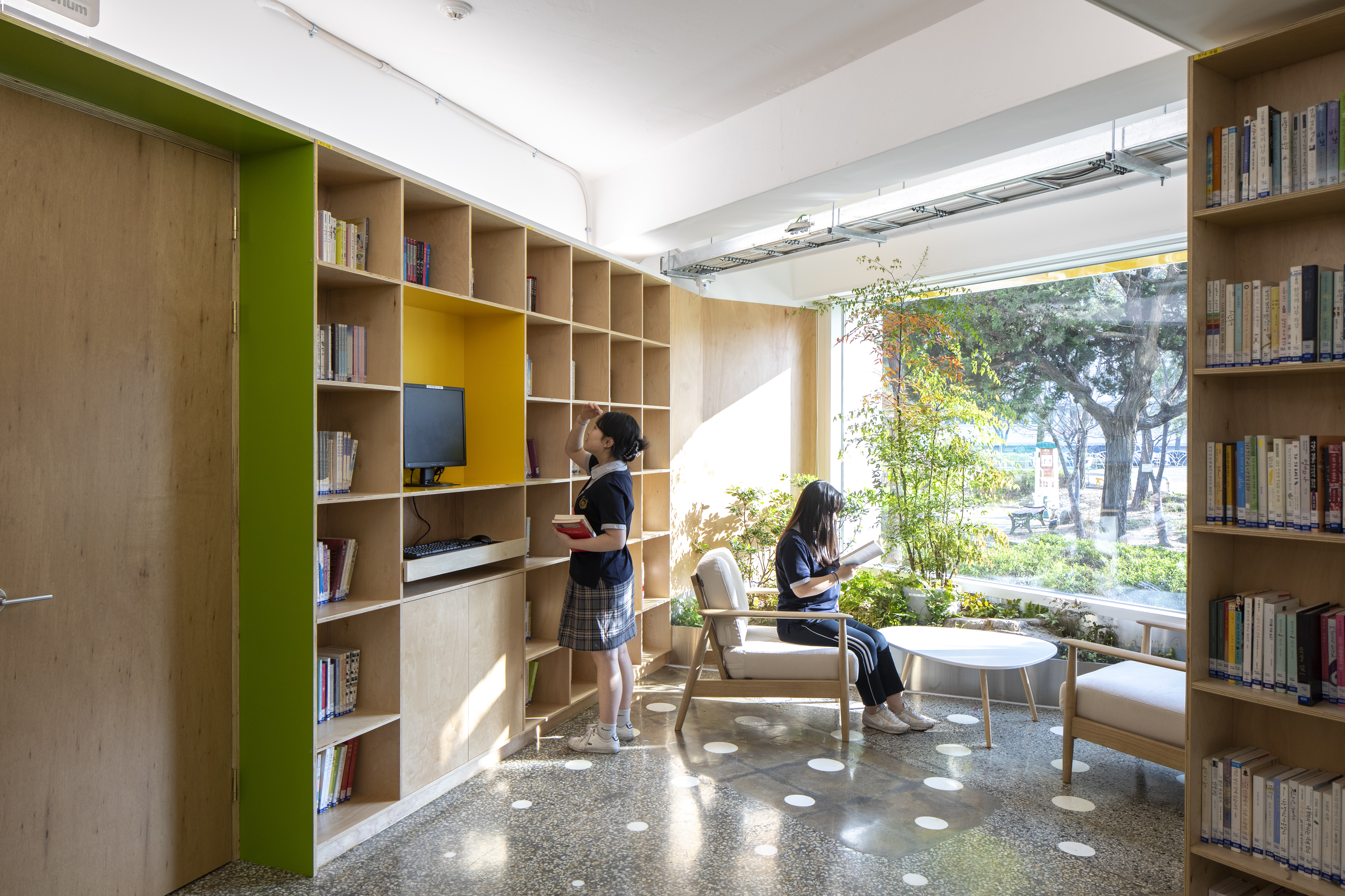 The remodeled library has been transformed to not only serve as a place to read books but also accommodate the various needs and activities of the students. The goal was for it to be a space where students could comfortably meditate during breaks and create their own cozy spots, akin to a "love nest." This led to the library adopting the theme of an urban park ecosystem, and it was named the “Forest Library.” Unnecessary external walls that disconnected the interior from the exterior were removed, and full-length windows and an outdoor terrace were installed. The newly created indoor landscaping defines the boundaries of the library's exterior through nature, opening toward the playground and creating a space where books and nature harmonize. The scattered seating arrangements break away from the rigid order of the past, allowing individuals to find their own spots. The revamped library is no longer hidden behind walls; it has evolved into a representative space where students can read books and engage in conversations. It provides students with an opportunity to experience a joyful place.