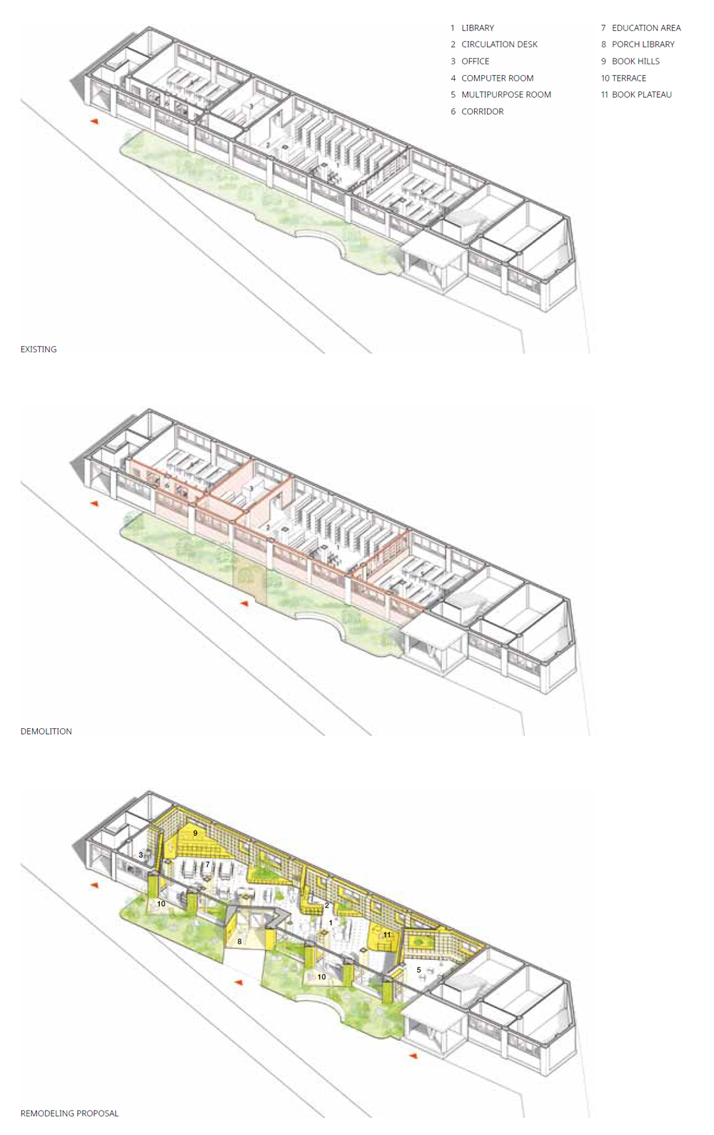 What should a high school library in Korea be like? The architects posed this question as they approached the remodeling project of the first-floor library in the east wing of Seongam International Trade High School. The existing library was situated in a typical school building, hidden behind walls and disconnected from other areas within the school. It was a space where students, aligned in rows, engaged in predetermined activities according to a set layout. Students desired a central area where they could freely linger and interact beyond the structured confines of the library. Through the remodeling project, the architects aimed to imbue the library with new possibilities.