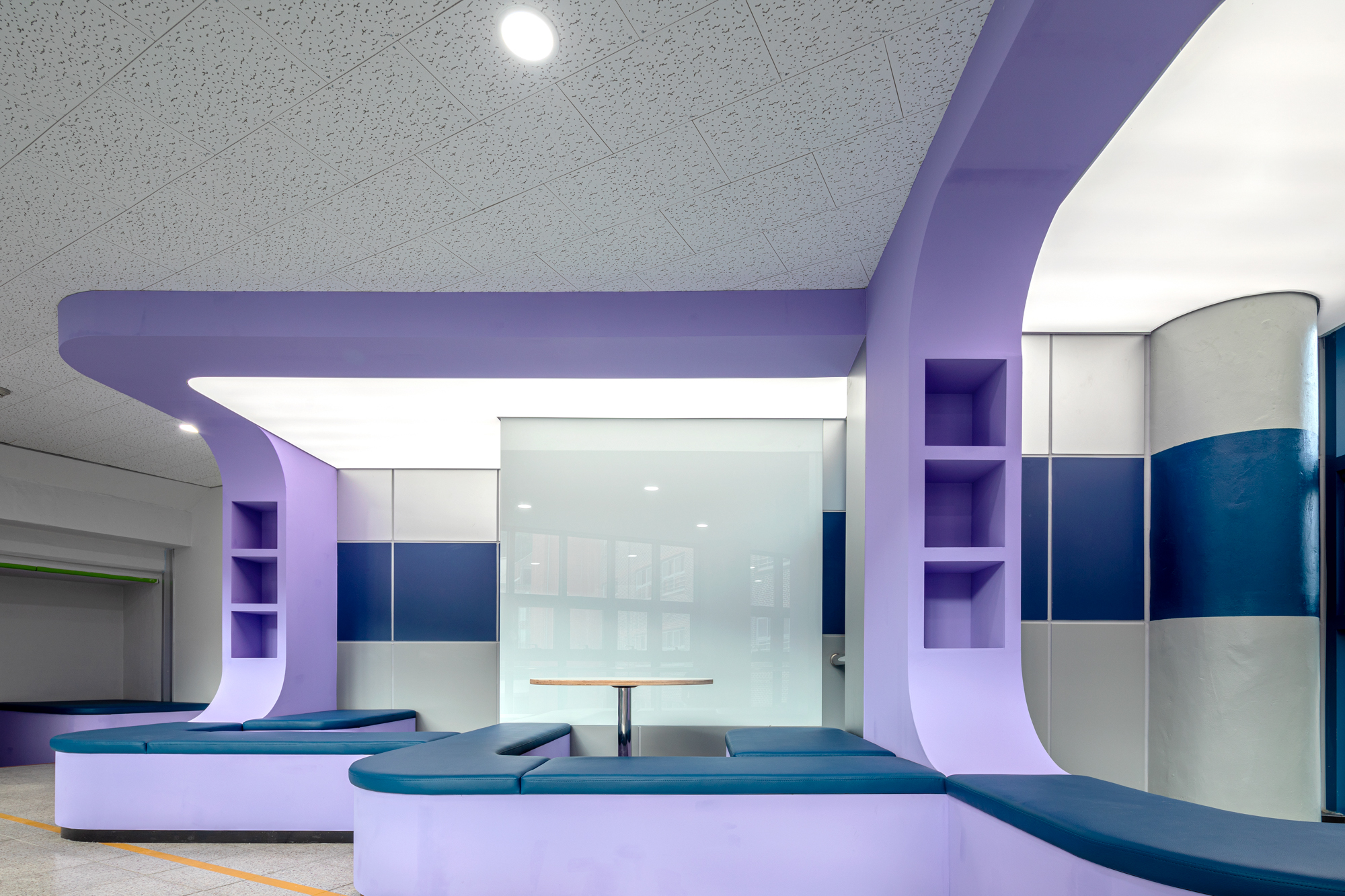 The space connecting Deoksan Middle School's existing building and the new building was more than a typical corridor, yet somewhat too narrow to be called a hall. Illumination was provided through a flat wall with a width of 4.5 meters, and on the opposite side, there was a space with lockers. The school's users, both students and teachers, desired a transformation of the conventional rigid corridor into a new gathering area where students could relax.
