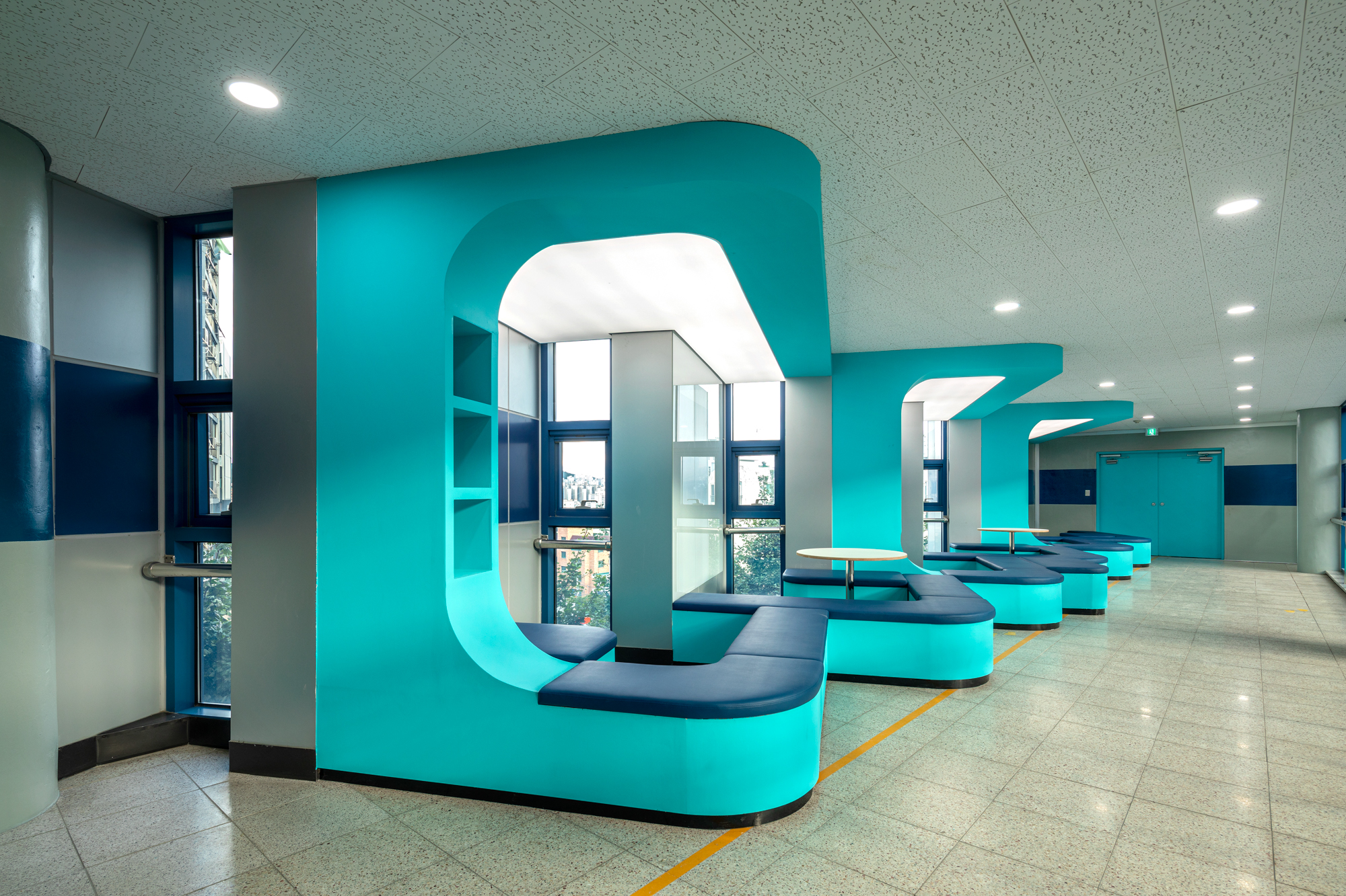 건축가는 요철이 있는 면을 이용하여 의자, 책상, 천장이 일체화된 가구를 제작했다. 움직일 수 있는 별도의 의자를 배치하여 학생들이 공간을 자유롭게 활용하도록 하였고, 광천장과 간이 책장, 유리 보드, 책상은 자율적인 모임과 휴식, 학습을 지원한다. 2, 3층의 휴식공간은 같은 디자인과 구조이나, 색상을 다르게 하여 공간을 구분했다.