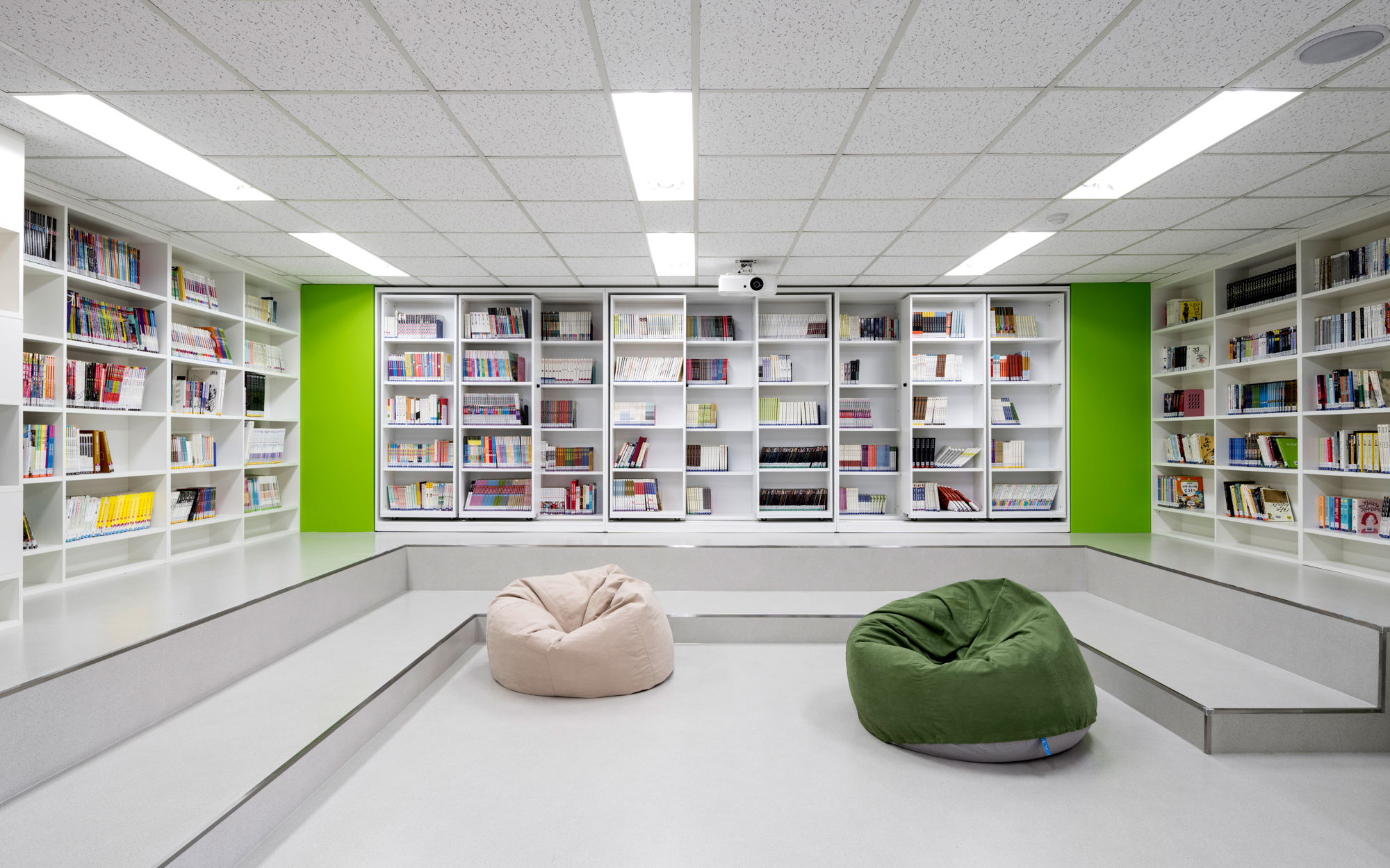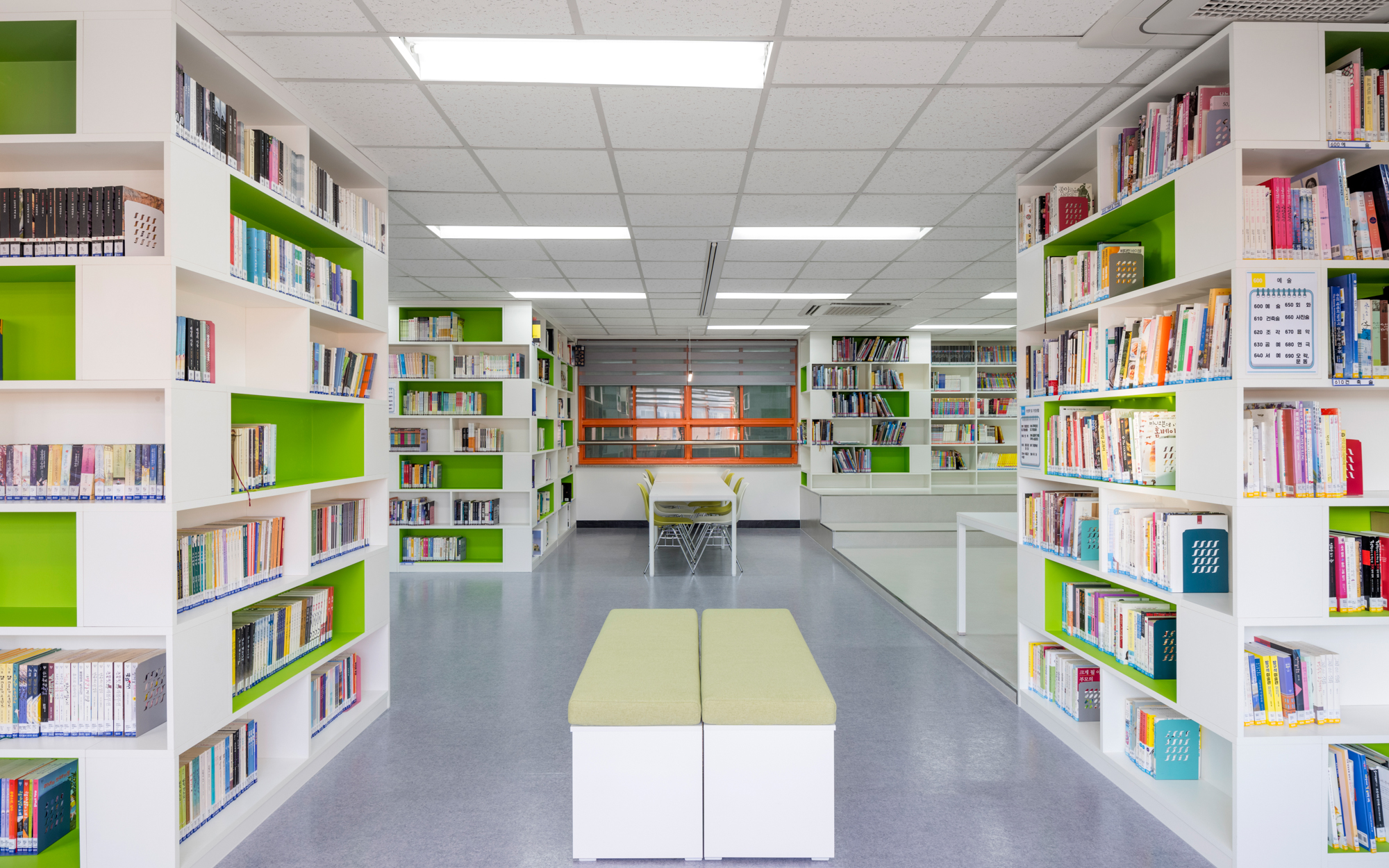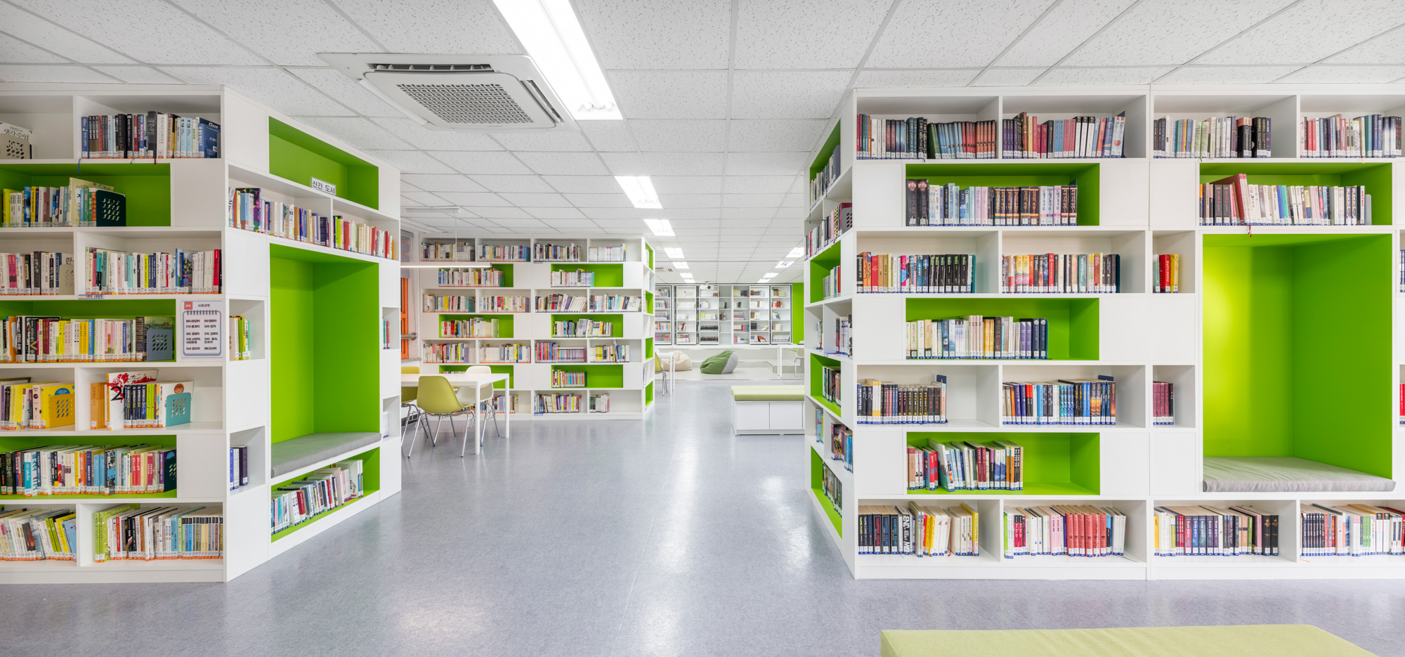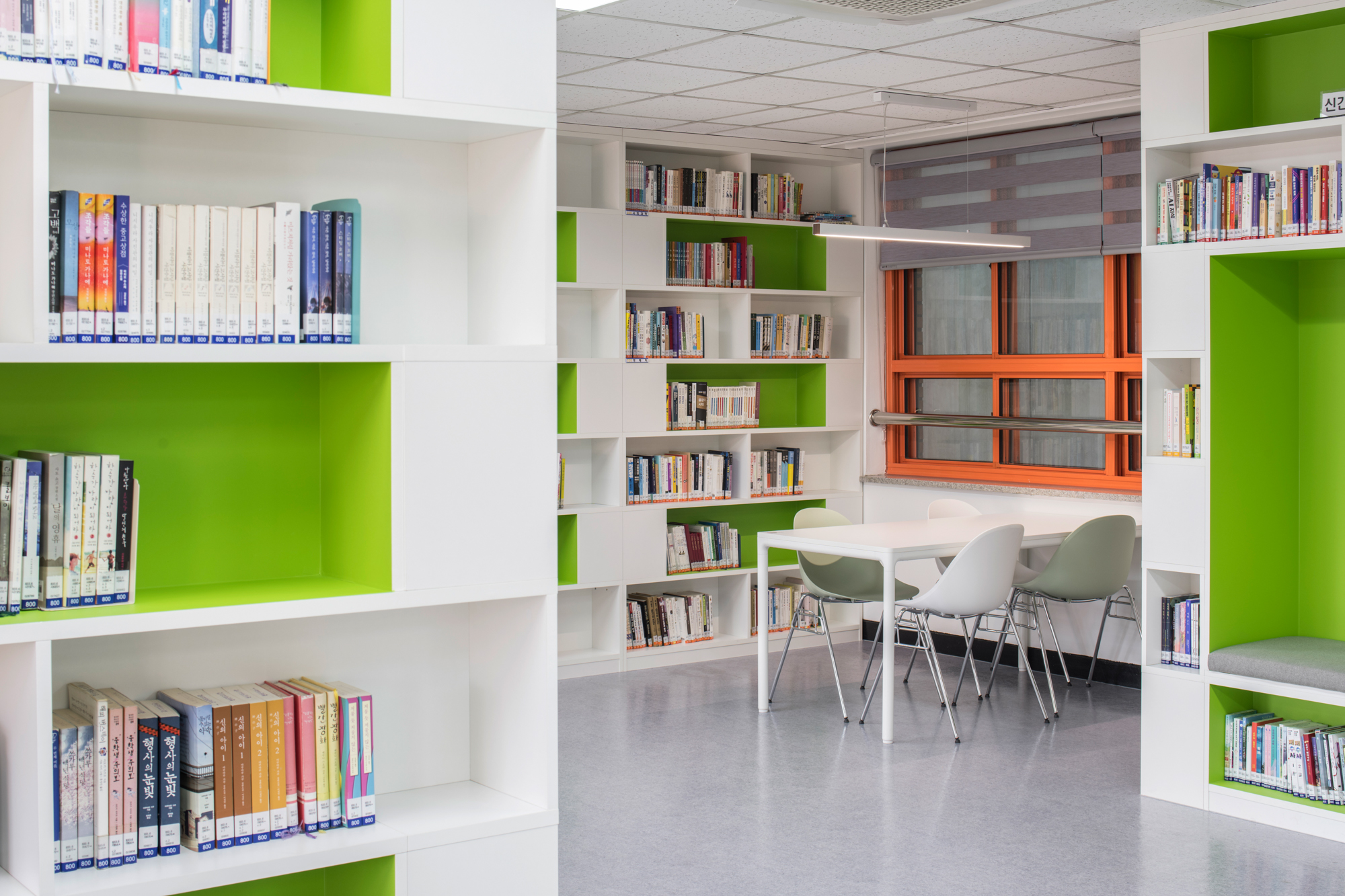건축가는 기존 학교 도서관의 전형적인 디자인에서 벗어나 밝고 화사한 카페와 같은 디자인을 적용하여 공간이 넓어 보이게 했다. 서가와 녹색의 가구는 직사각형의 서가를 병렬로 배치하는 구조에서 벗어나 지그재그 형태로 엇갈려 배치해 다채로운 느낌을 더한다. 도서관에는 구조 기둥을 감싸는 서가(Book Pillar)를 기둥 형태로 제작 및 배치하여 도서관의 면적 활용을 극대화했다. 내측 창에 인접한 독서공간과 서가로 둘러싸인 계단형 공간은 도서관 내의 다양한 교육 프로그램을 장려한다.